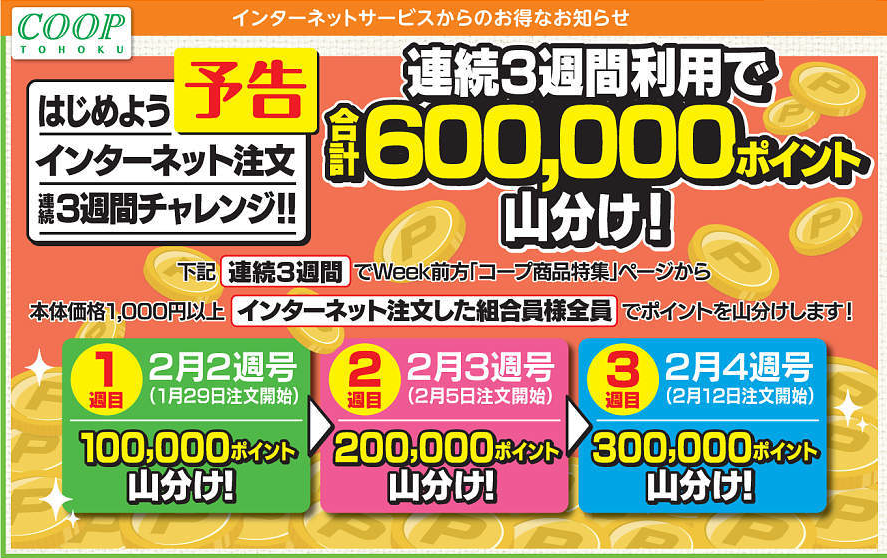 【インターネット企画】 2月2週号~2月4週号の連続3週間利用で600,000ポイント山分け!