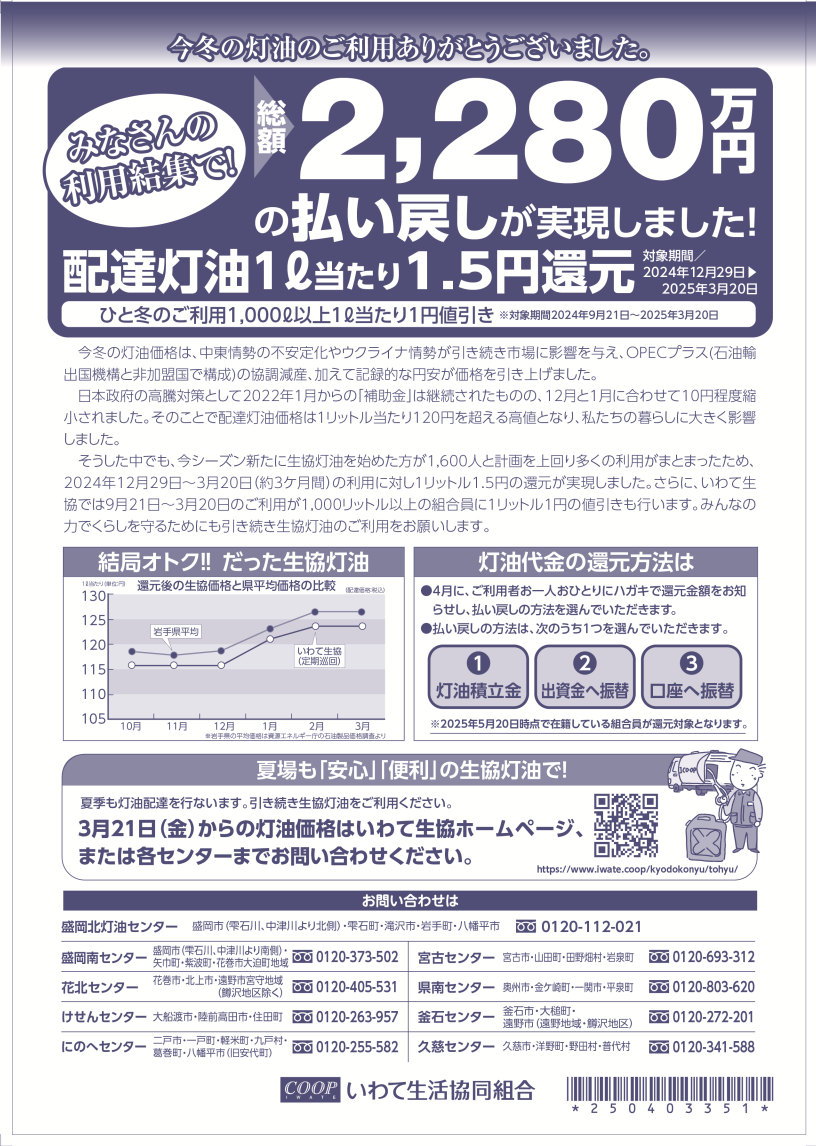 今冬の灯油ご利用ありがとうございました。配達灯油1リットル当たり1.5円還元!