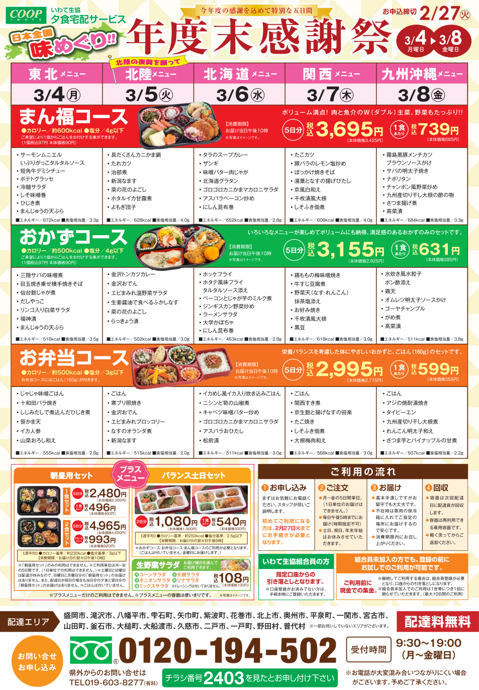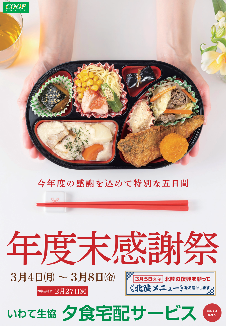 今年もやります!「年度末感謝祭!!」 今年度の感謝を込めてお届けする特別な5日間♪ おうちでおいしく日本全国の味めぐりをお楽しみいただけます。 3/5(火)には、北陸の復興を願って「北陸メニュー」をお届けしますよ! 申し込みは2月27日(火)まで!