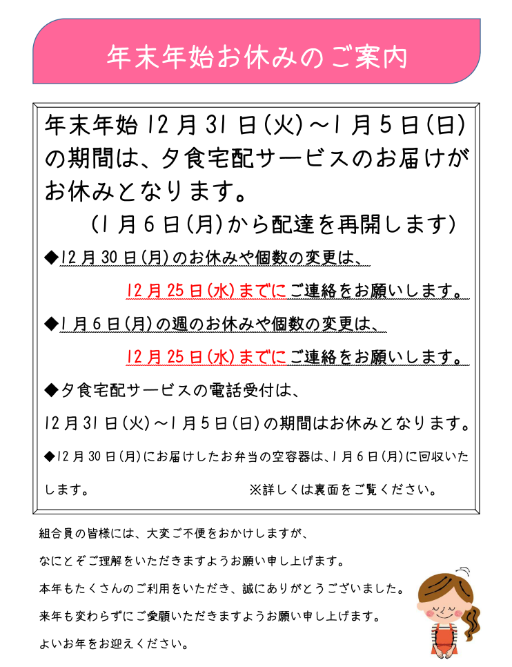 年末年始12月31日(火)~1月5日(日)の期間は、夕食宅配サービスのお届けがお休みとなります。(1月6日(月)から配達を再開します)
