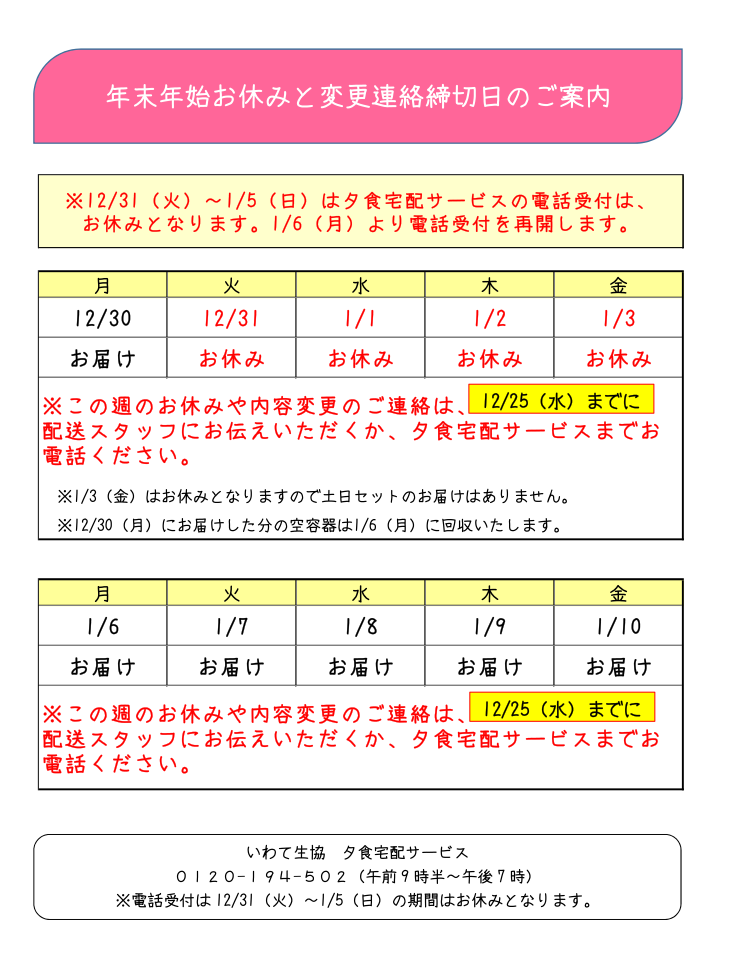 ◆夕食宅配サービスの電話受付は、12月31日(火)~1月5日(日)の期間はお休みとなります。