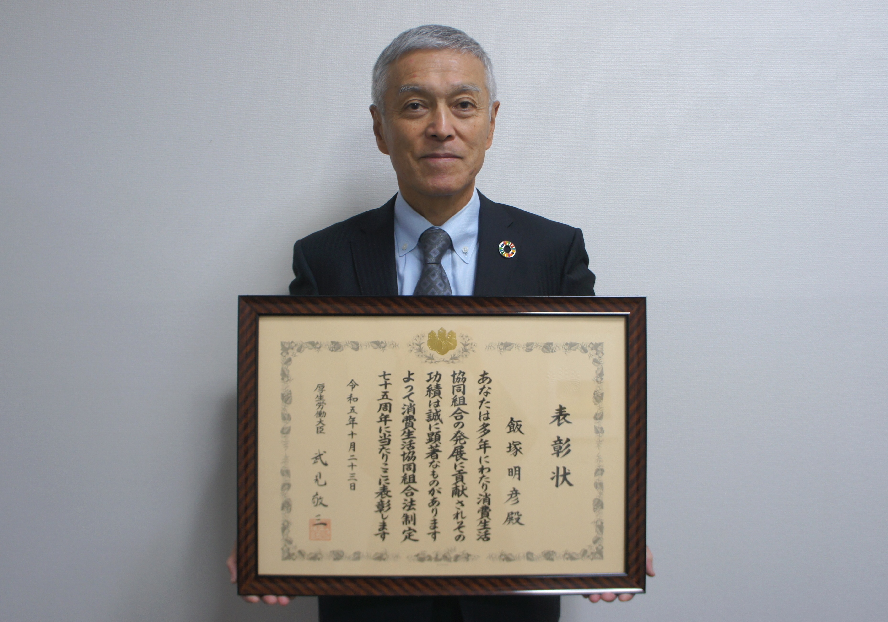 消費生活協同組合法の制定75周年を記念した厚生労働大臣表彰で、いわて生協理事長 飯塚明彦が個人表彰を受けました。