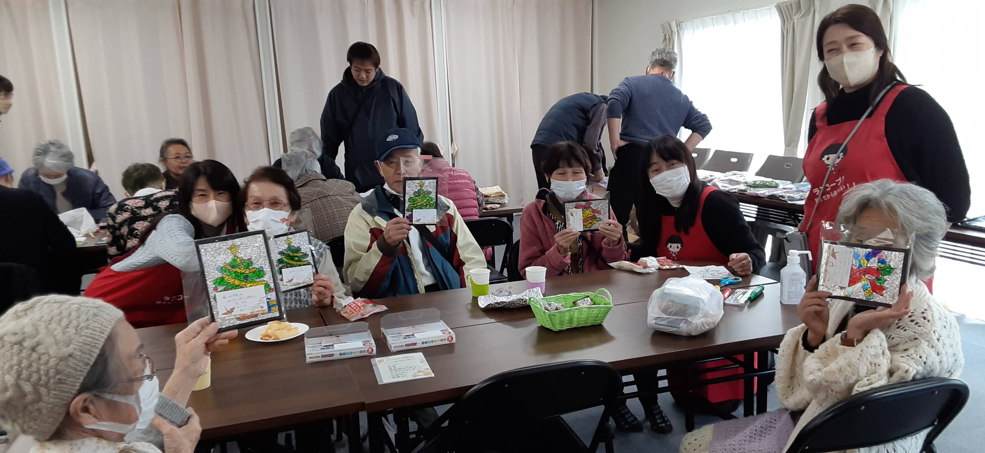 ステンドグラス風のクリスマス飾りを作りながら、東北の銘菓や飲み物も楽しみました。