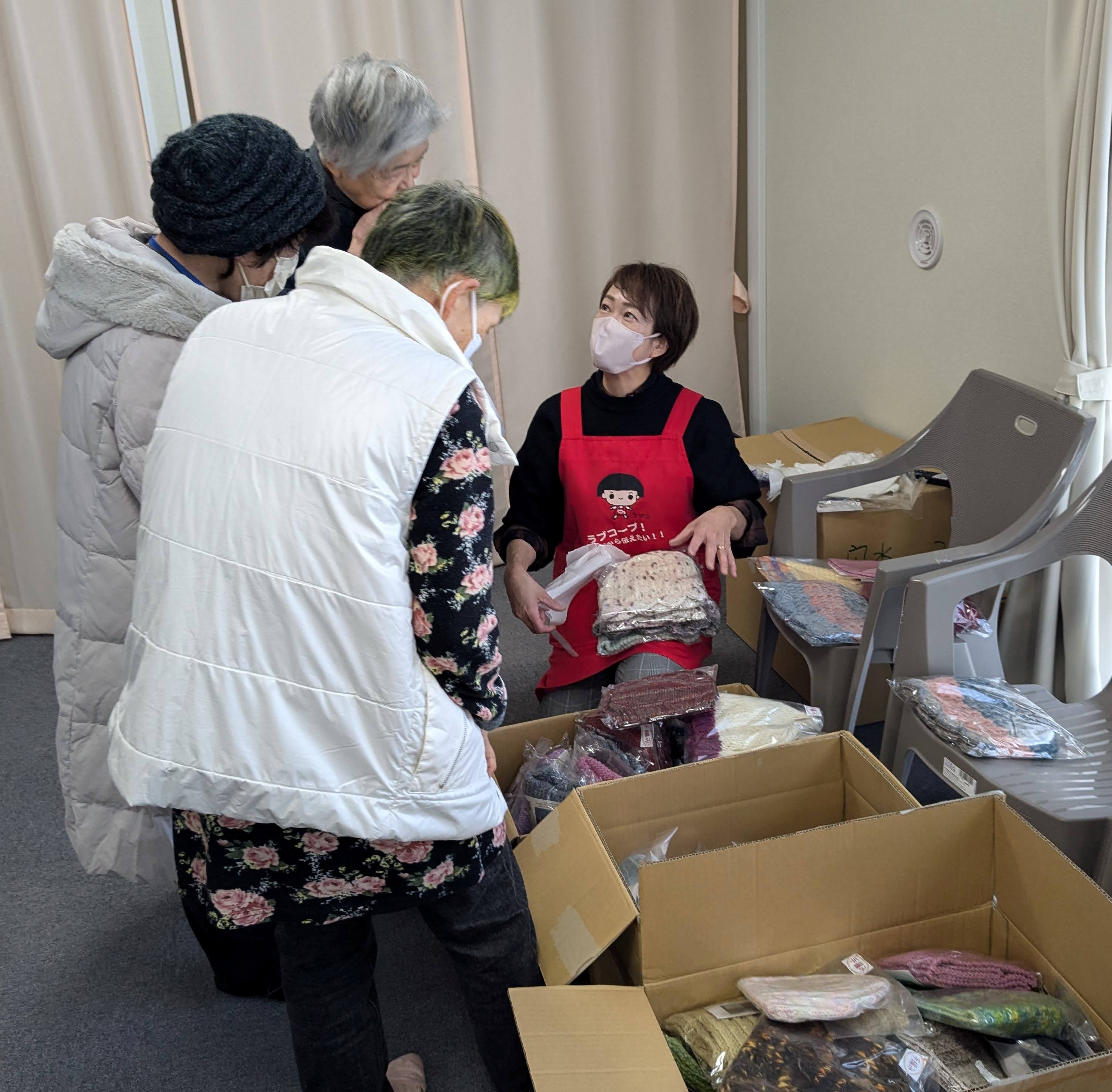 岩手の2つの団体に作成していただいたニット小物のプレゼントを、2日とも行いました。「どれが似合うかな」と、じっくり選ぶ方も多く、「クリスマスプレゼントだね」と喜んでいただきました。