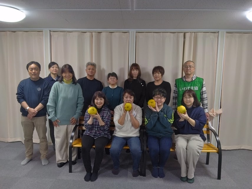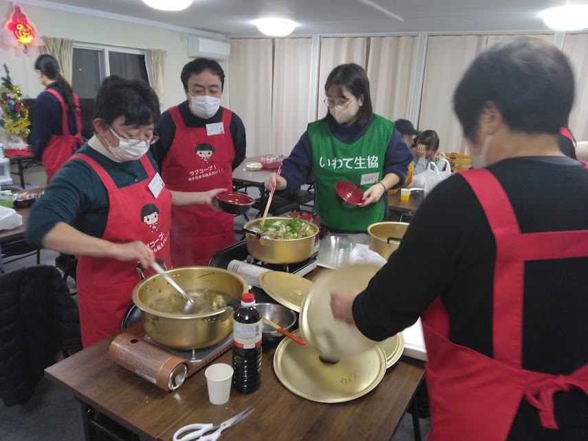 コープあきた、コープあおもり、みやぎ生協、いわて生協から組合員・職員がお邪魔して、秋田の「きりたんぽ鍋」50食をお振舞しました。