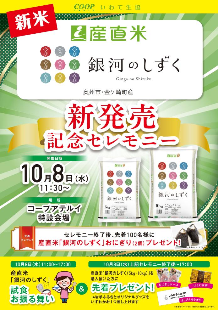 > 「産直米 銀河のしずく 新発売記念セレモニー」開催 10月8日(水)コープアテルイ