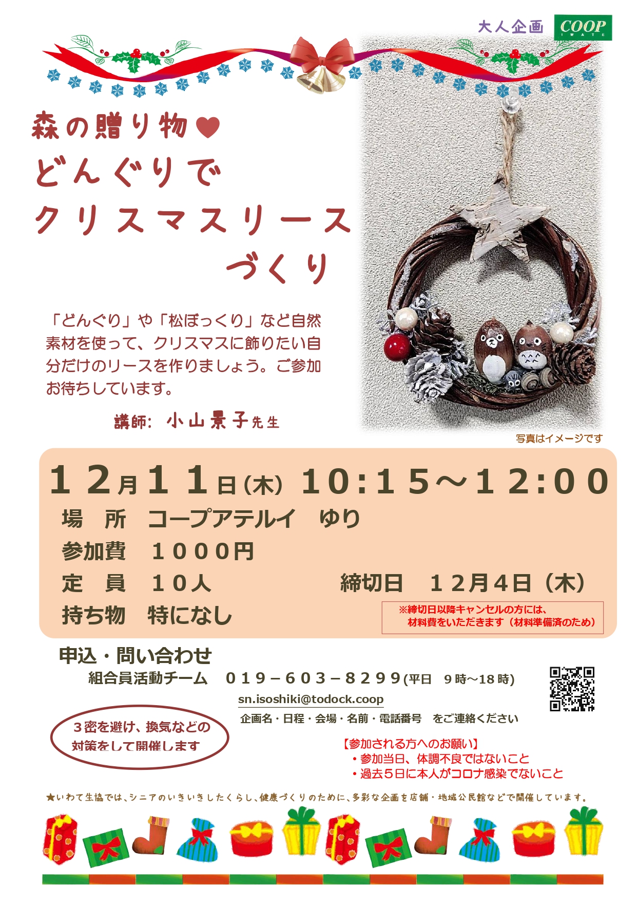12月11日(木)森の贈り物♡どんぐりでクリスマスリース作り[コープアテルイ]