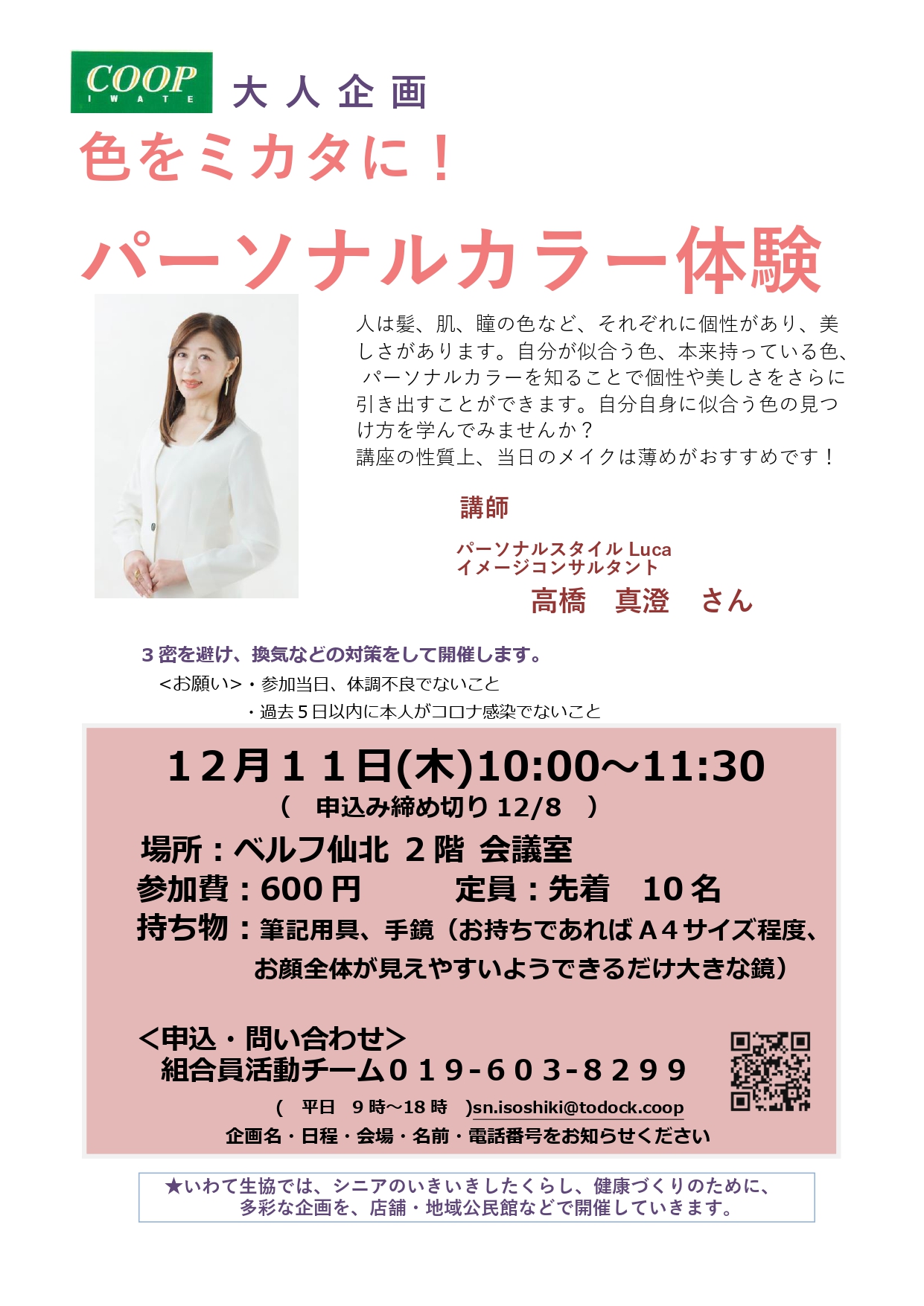 12月11日(木)色を味方に!パーソナルカラー体験[ベルフ仙北]