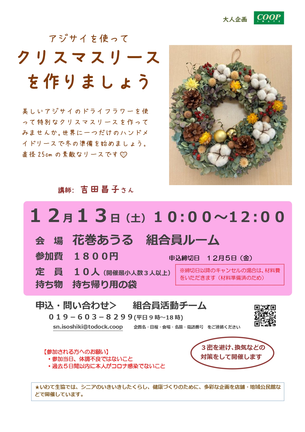 12月13日(土)アジサイを使ってクリスマスリースを作りましょう[花巻あうる]