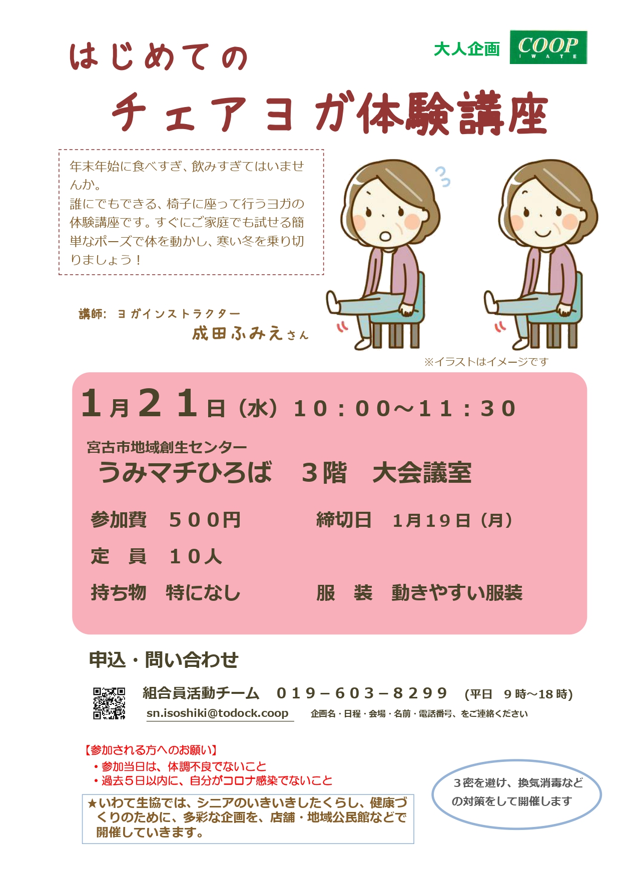 1月21日(水)はじめてのチェアヨガ体験講座[宮古うみマチひろば]