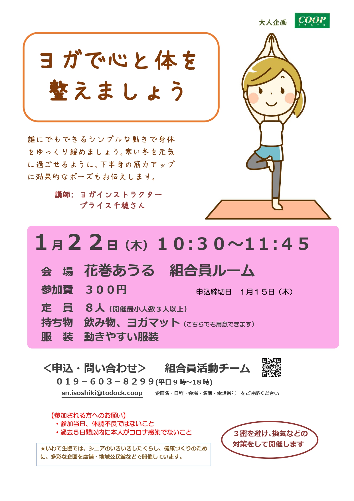 1月22日(木)ヨガで心と体を整えましょう[花巻あうる]