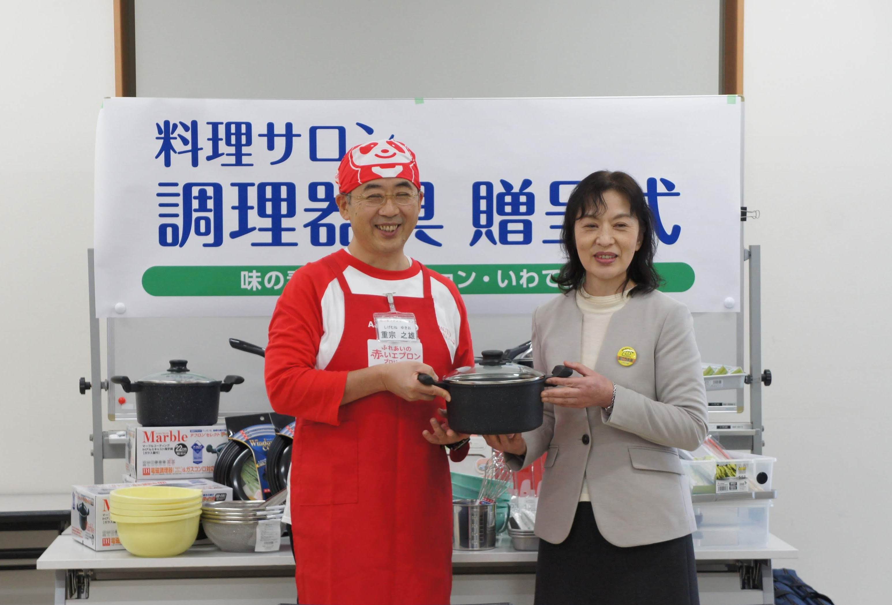 11月20日(火)けせんセンターで贈呈式が行われ、公益財団法人 味の素ファンデーション専務理事 重宗之雄様から「被災地で行ってきた『赤いエプロン』活動を、生協に引き継いでいただけることになり、調理器具を贈ります。ぜひ使い倒してください」とお話いただきました。