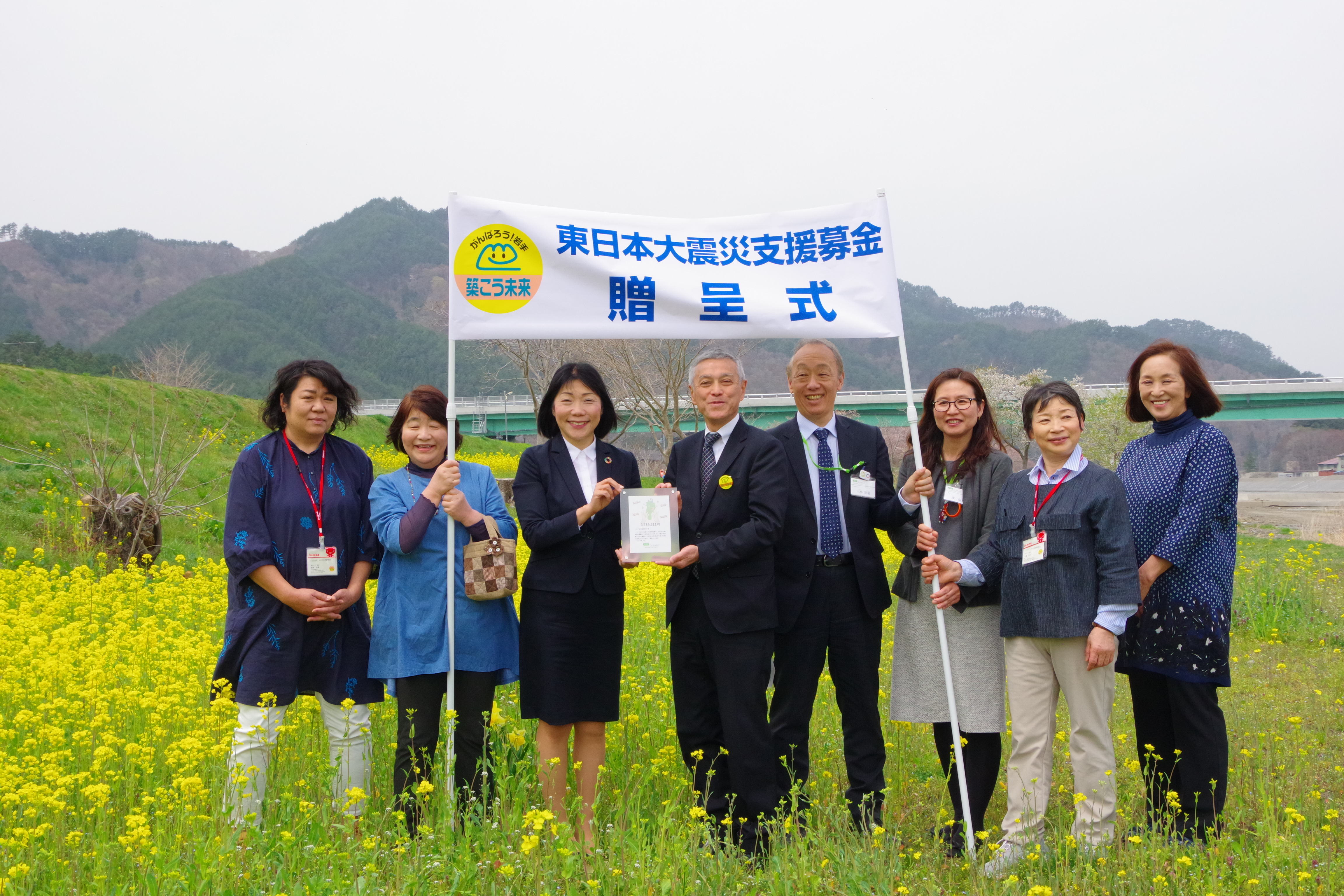 バスボランティアで活動した大槌町の菜の花畑で、贈呈式を開催しました。