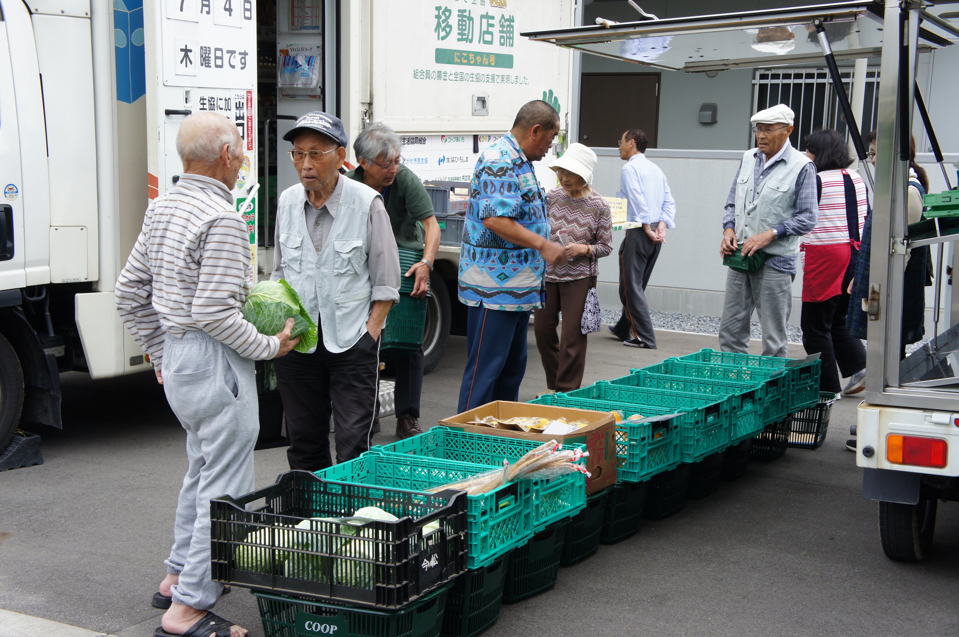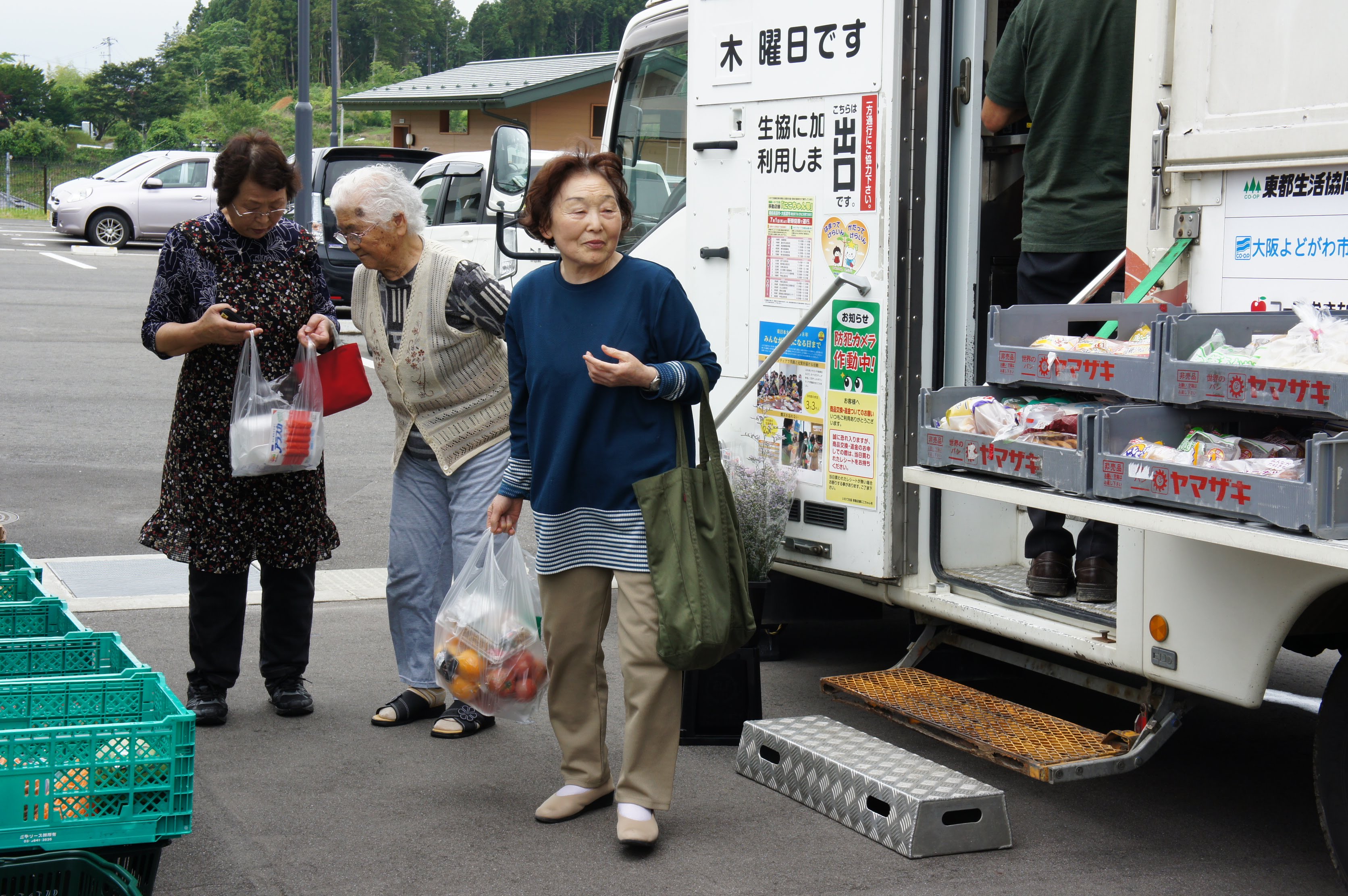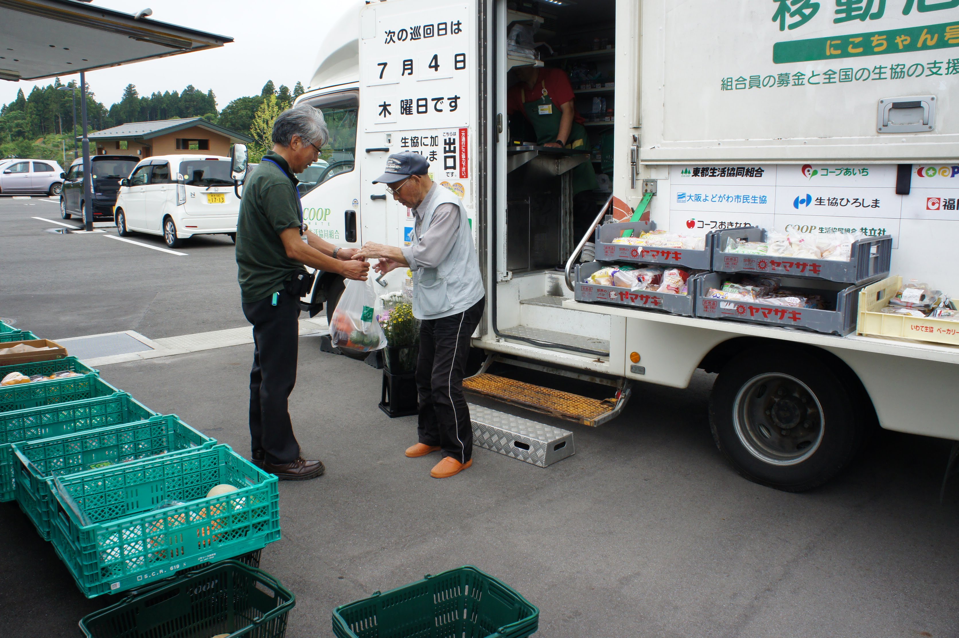 災害公営住宅の完成に伴い、仮設住宅の撤去が進んでいます。移動店舗「にこちゃん号」もその都度コースを見直し対応してきましたが、さらに転居が進んだことから、ご利用者や地域のみなさんの声を反映し、7月1日から大船渡・陸前高田のコースを変更しました。