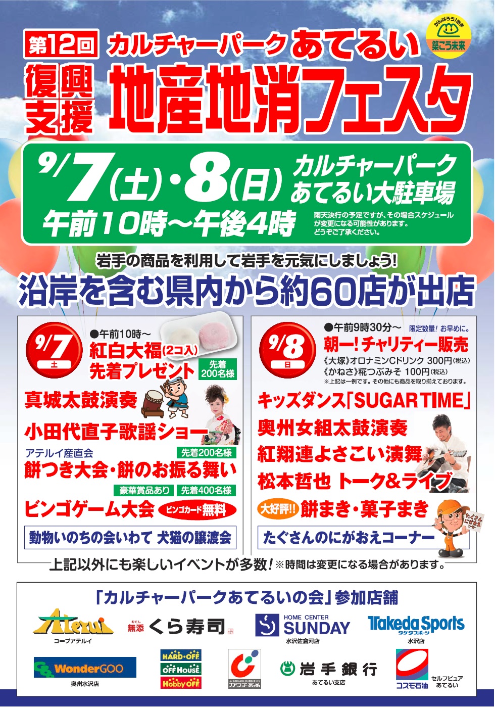 > 9月7日(土)・8日(日)★カルチャーパークあてるいで「復興支援・地産地消フェスタ」を開催します!