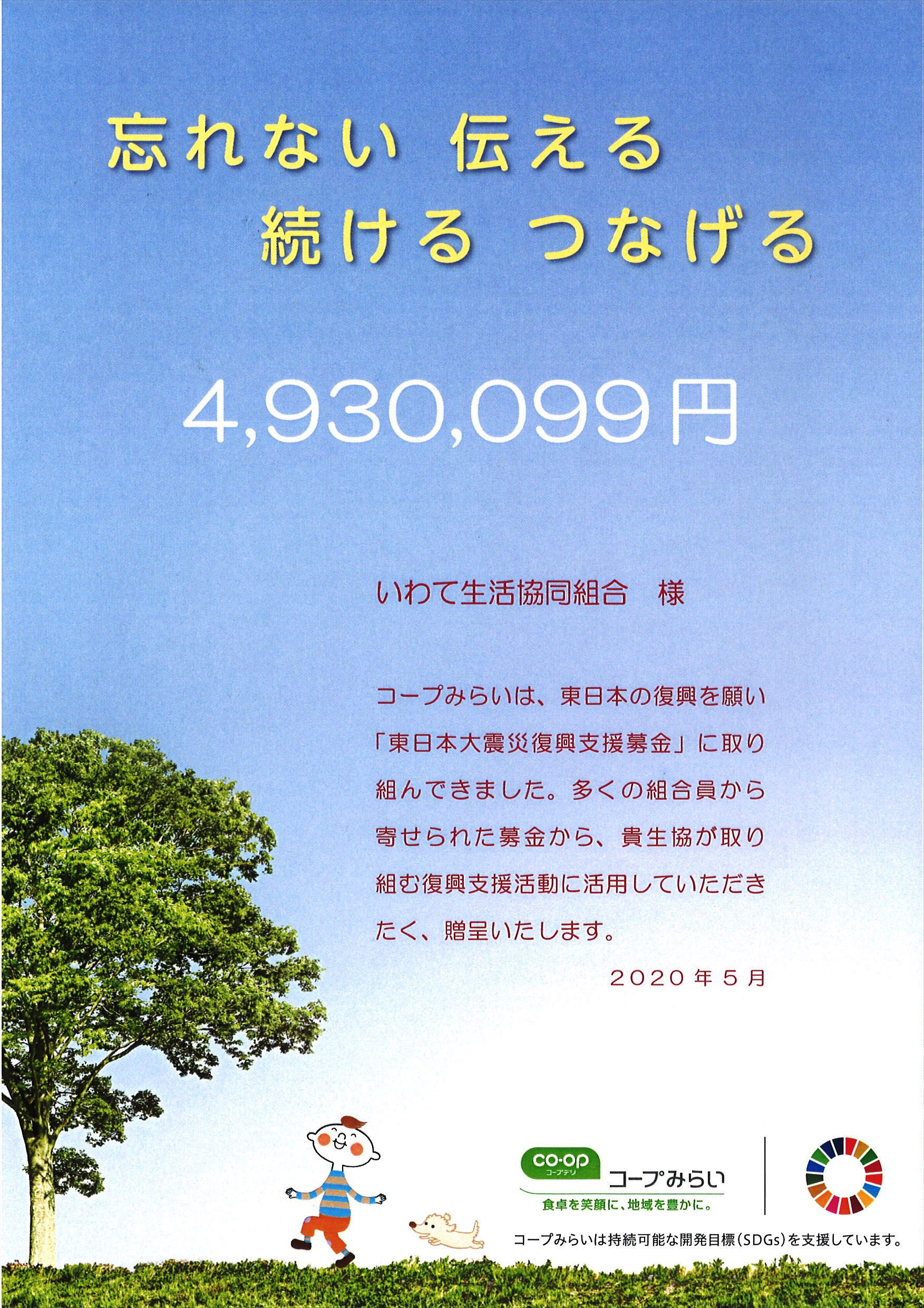 東日本大震災から9年経ちましたが、コープみらいは「忘れない・伝える・続ける・つなげる」を合言葉に想いをひとつにしてきました。2019年度にお寄せいただいた募金は、17,516,984円です。今回みなさまに目録をお贈りさせていただきます。これまでと同じように被災地・被災者に寄り添った支援にお使いいただけたら嬉しいです。そして良い機会を見つけて表敬訪問させていただけたら・・・希望です。