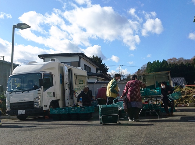 被災してから仮設住宅に5年暮らし、復興住宅(災害公営住宅)に移って5年目になります。移動店舗「にこちゃん号」にはスタート時からお世話になっています。昨年、これまでの販売場所が使えなくなり、ならば復興住宅の敷地内に来てほしいと市や自治会にも掛け合って、11月に実現しました。私は民生委員をしていますが、「買い物に困る」という話をよく聞きます。お店へ車なら数分ですが、歩くと30分。やはり遠いんですね。週2回の「にこちゃん号」と週1回の共同購入が、くらしの支えです。お刺身など、商品を見て買う楽しみが「にこちゃん号」にはあります。