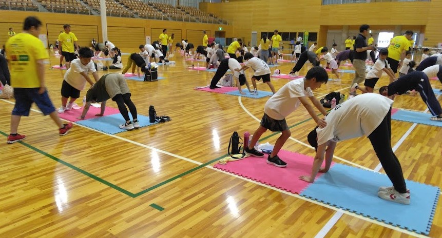 8月19日、宮古シーアリーナ(宮古市)で高田道場ダイヤモンドキッズカレッジが開催され、参加者は家族ペアでいっしょに体を動かし楽しみました。
