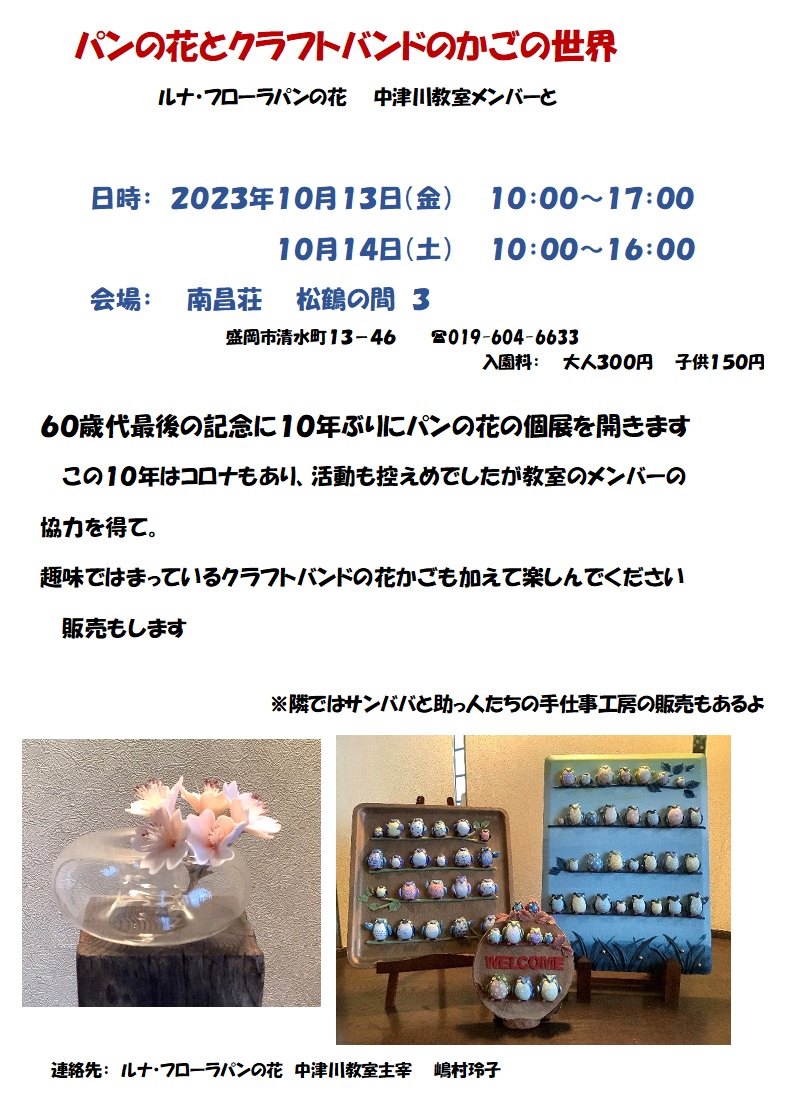 「パン」も「花」も誰でも知っているものですね。 では「パンの花」は? 今週はこの「パンの花」の催しがあります。 指先から生まれたかわいい作品や、クラフトバンドの花かごも並びます。 14日(土)にいらっしゃると2つ楽しめます。