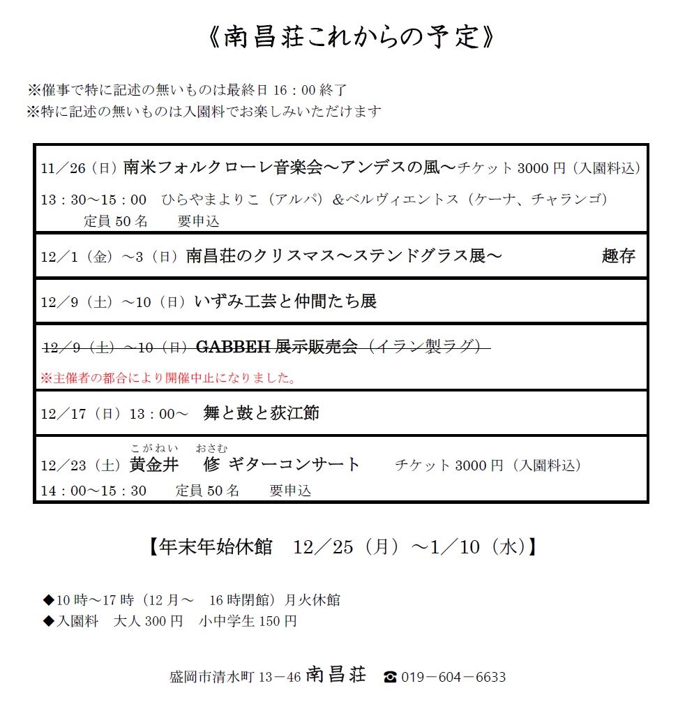 南昌荘 11月26日(日)~12月23日(土)の催し物