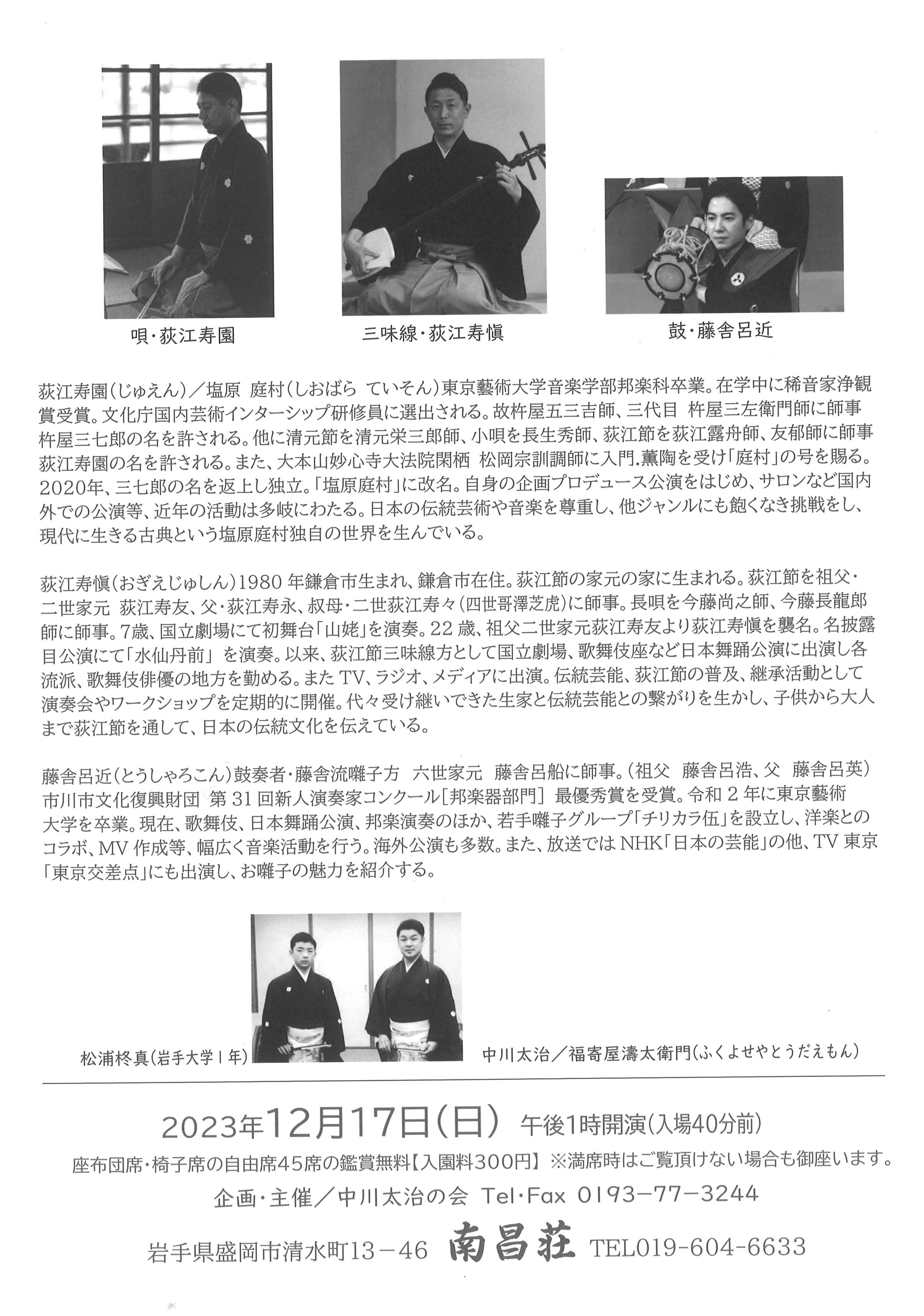 いよいよ辰の姿が見え隠れするころになりました。 何かと気ぜわしい今日この頃ですが、南昌荘で日本の伝統文化に触れてみませんか。 宮古市在住の中川太治さん主催の催しです。入園料でどなたでも観覧できます。 どうぞ暖かくしてお出かけくださいませ。