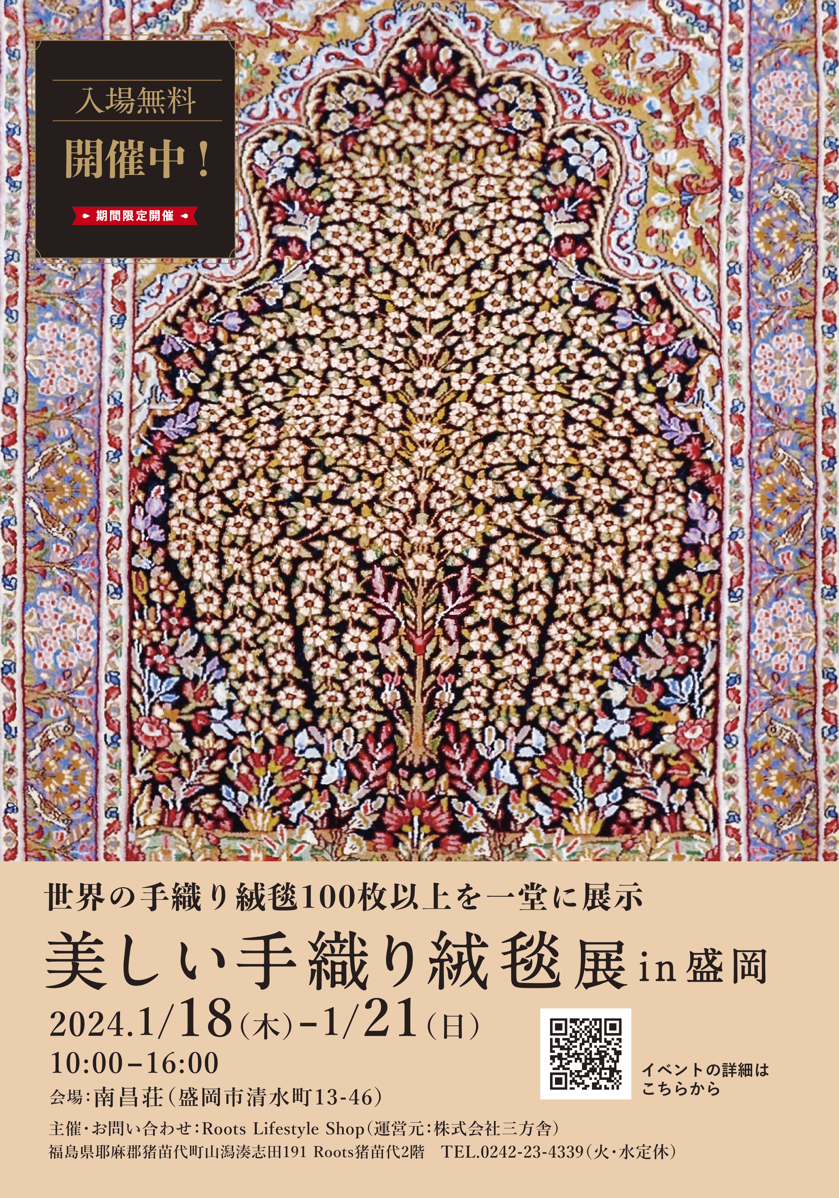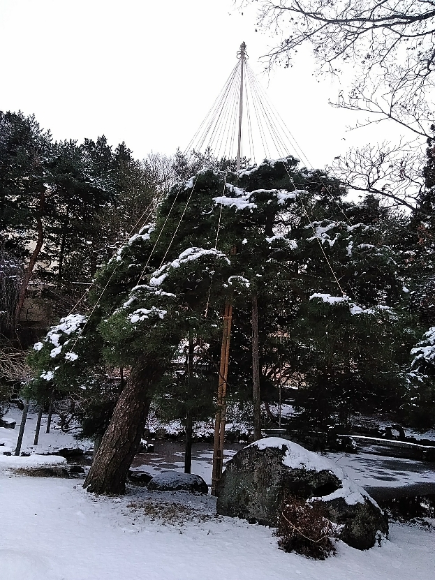 暖冬で油断していたら、一転雪景色。 南昌荘の庭園の松も雪吊に助けられています。 雪景色をじっくり撮影するお客様もチラホラ… 【今週の催し物】 ※15日(月)16日(火)は休館日です。 やさしい服・靴展 20日(土)まで開催中 美しい手織り絨毯展 18日(木)から21日(日) どうぞ暖かくしてお越しください。