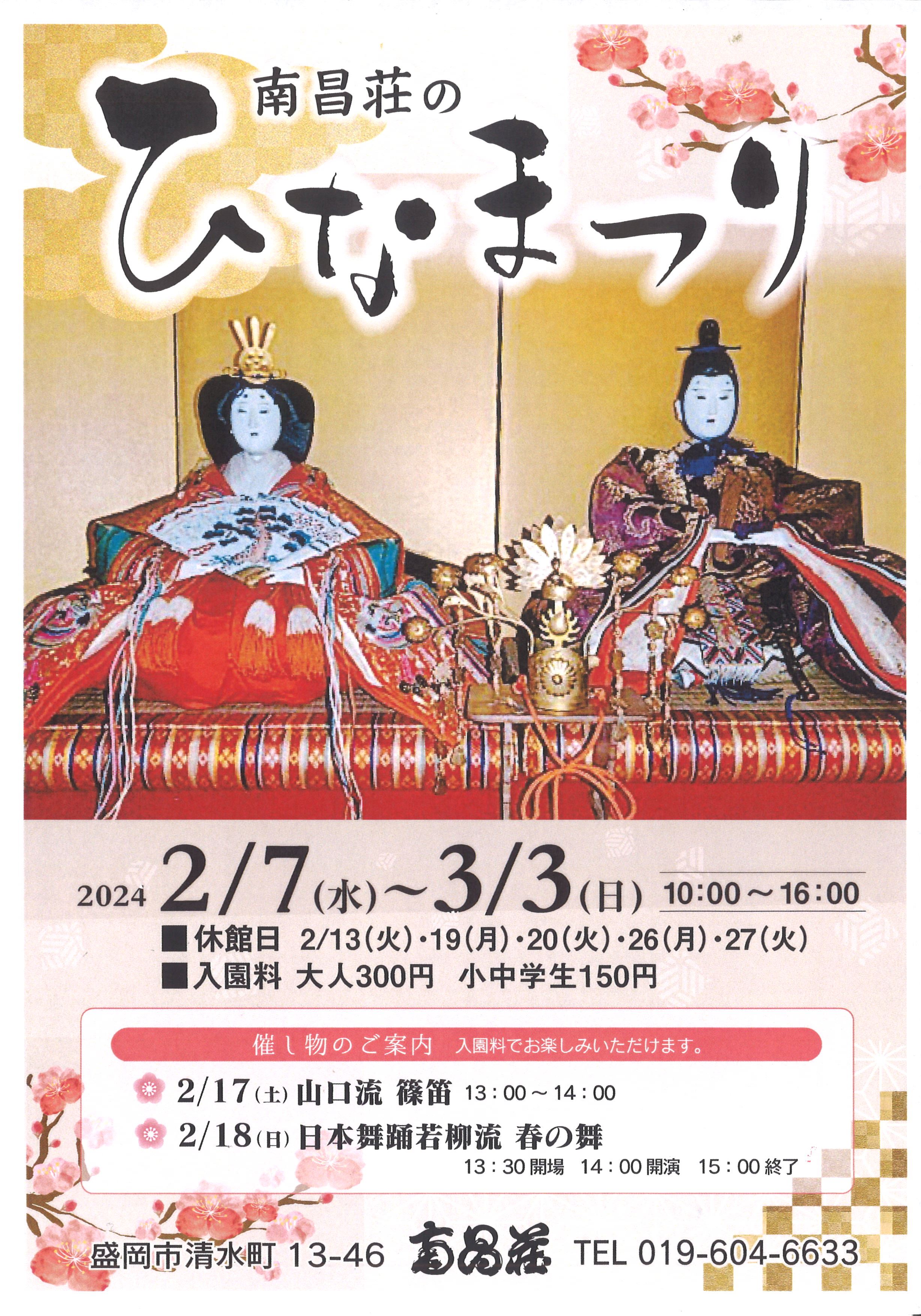 気がつけばもう2月。 暖冬に加え、日ごとに伸びる日脚に春を感じる頃となりました。 今年で24回目となる南昌荘のひなまつりのご案内です。 歴史を感じるおひな様や工夫をこらしたおひな様などを、館内のお部屋、廊下、階段まで飾りひなの館になります。 どうぞ暖かくしてお出かけくださいませ。