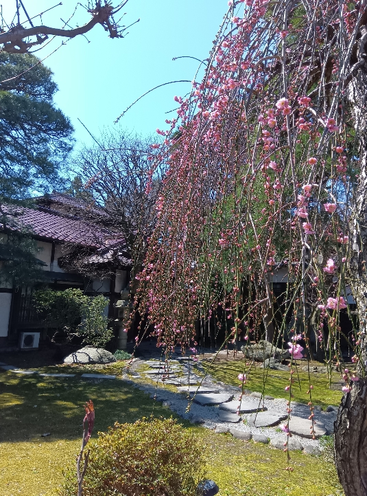 花々が「待っていました!」とばかりに開くこのごろ。 南昌荘の入口にある花も、ほころび始めました。 優雅に枝が下がるこの木は、しだれ梅です。 しだれ桜はよく知られていますが、しだれ梅はちょっと珍しいようで、お客様に案内すると「初めて見たわ」と言う方も…。 近づくとうっとりする香りも楽しめます。 春のお出かけにどうぞお立ち寄りくださいませ。