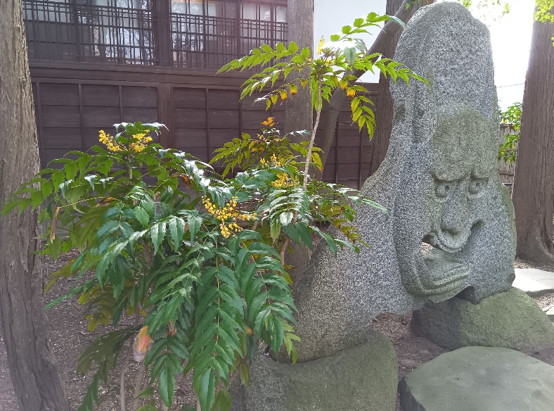 黄色い花をつけたヒイラギナンテンは、ヒイラギのようにとげがあり、果実のつき方がナンテンに似ることから名付けられました。 ナンテンは難転の字を当て「難を転じて福となす」縁起の良いものとしてお正月に飾ったりします。 南昌荘は大きな石の般若が悪い者に、にらみを利かせその脇にあるヒイラギナンテンが難を転じてくれることでしょう。