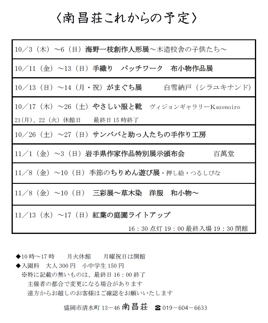 南昌荘 10月3日(木)~11月17日(日)の催し物