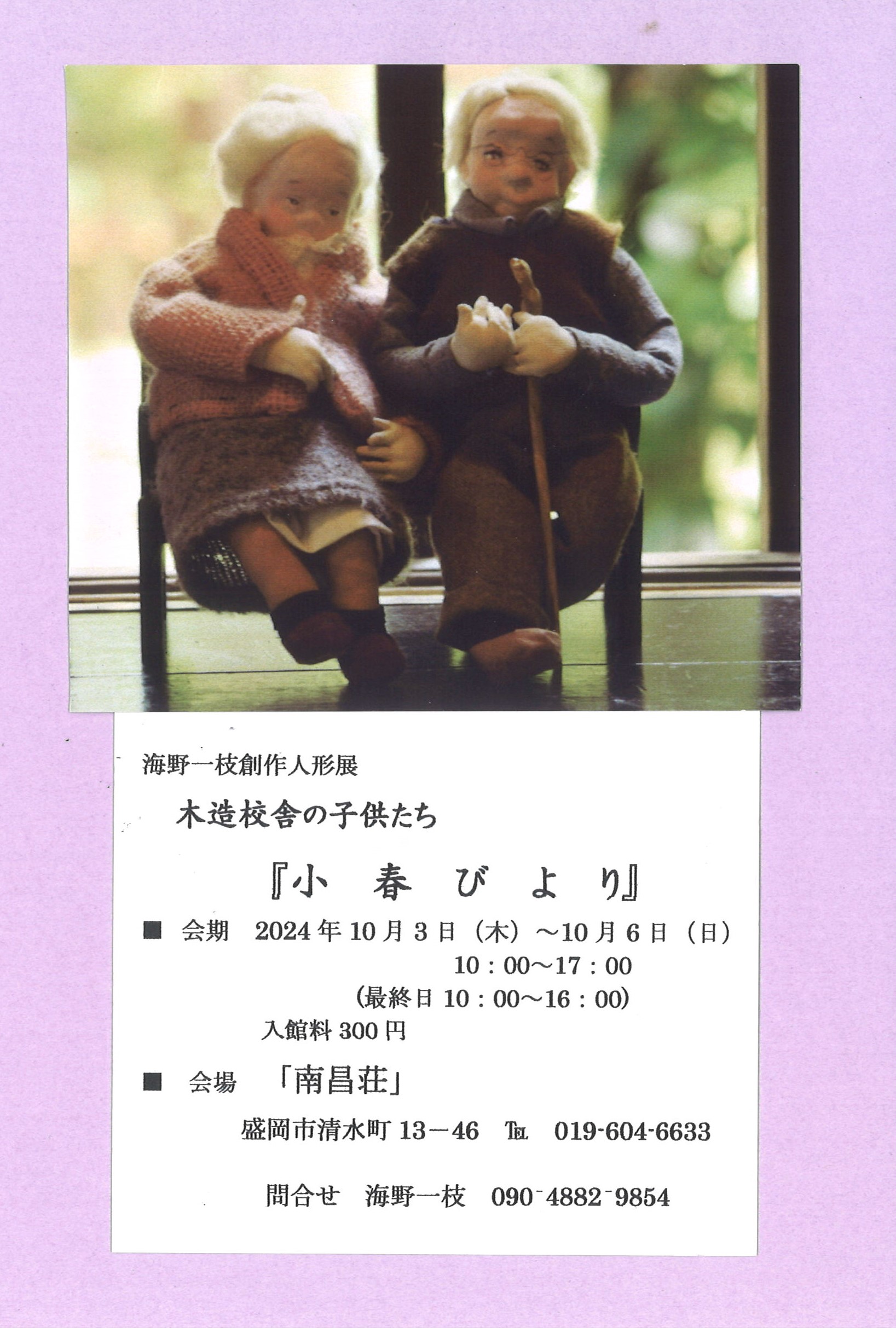 盛岡の創作人形作家・海野一枝さんの作品展・木造校舎の子供たち『小春びより』 が、10/3(木)~6(日)まで開催されます。 見る人に、なつかしい木造校舎の日々を思い出させてくれます。 旧友を誘ってどうぞお出かけくださいませ。
