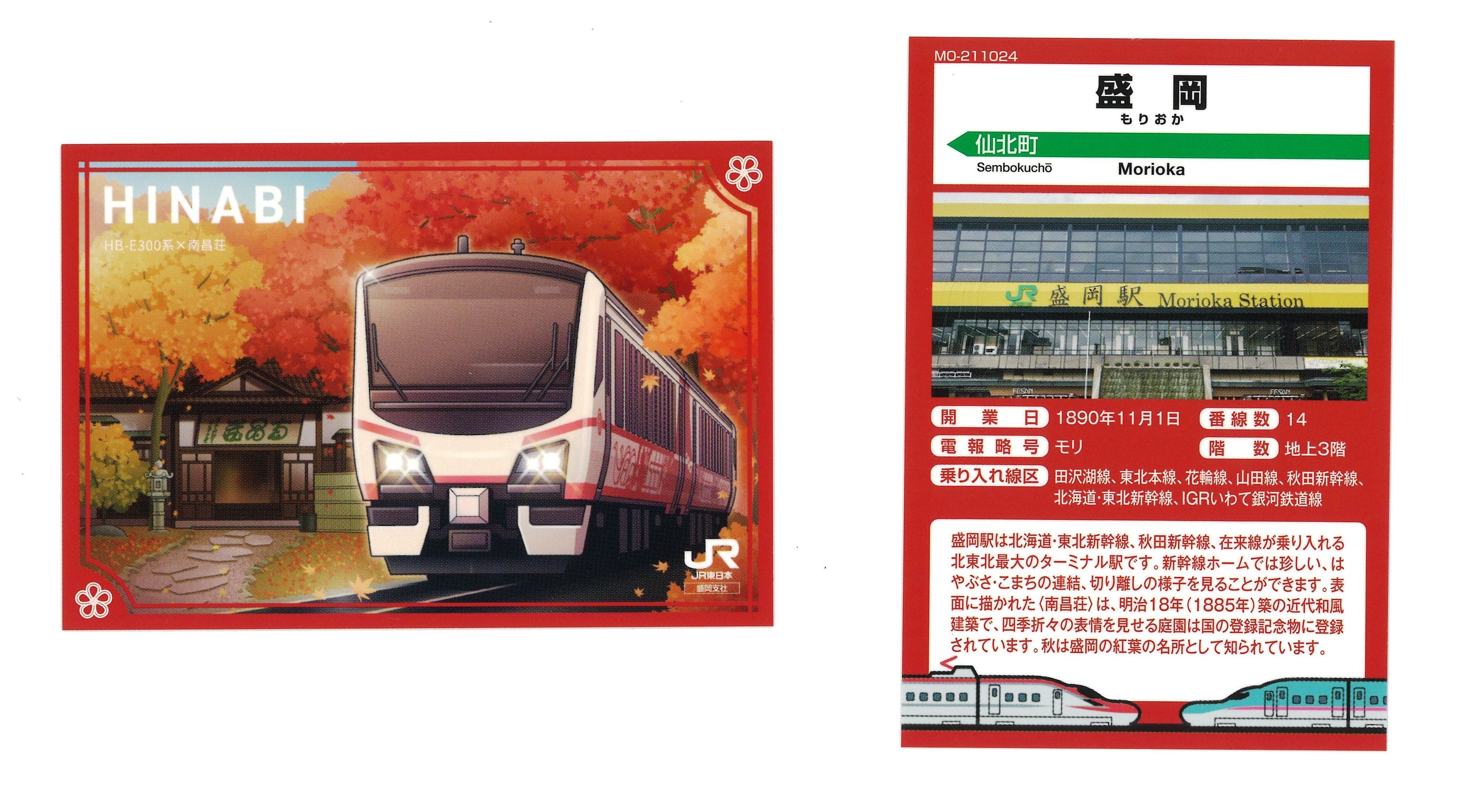 JR東日本盛岡支社では「『ひなび(陽旅)』駅カードコレクション」を開催中です。(12/31まで) 盛岡駅で当日有効な乗車券類(入場券もOK)を、南改札係員へご提示ください。 盛岡駅のカード(5.8㎝×8.5㎝)には紅葉の南昌荘が描かれています。 釜石駅やひなびの車内でも配布されますので、旅の思い出にいかがでしょうか。