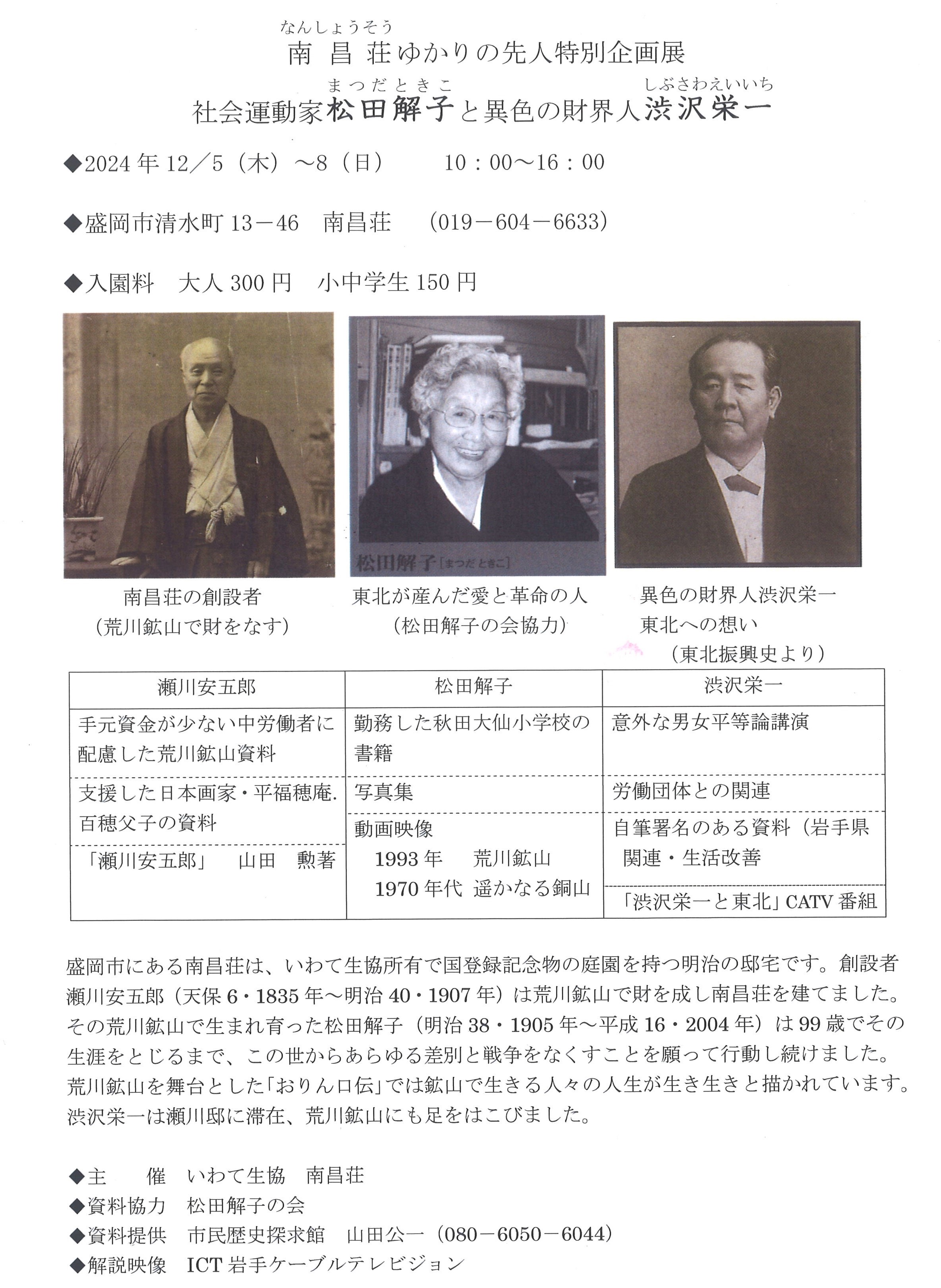 来年のカレンダーに思いを馳せる頃となりました。 来春で築140年を迎える南昌荘には歴史をつむぐ人々が、かかわってきました。 秋田の荒川鉱山で財をなし南昌荘を創建した瀬川安五郎 荒川鉱山で働く人々の人生を描いた「おりん口伝」の作者松田解子 瀬川と交流のあった渋沢栄一の貴重な資料をご覧ください。