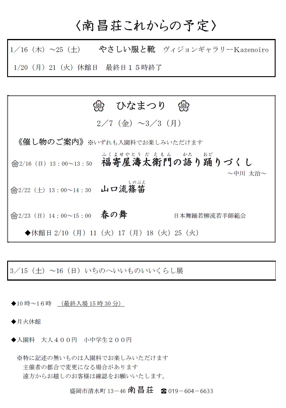 南昌荘 1月16日(木)~3月16日(日)の催し物