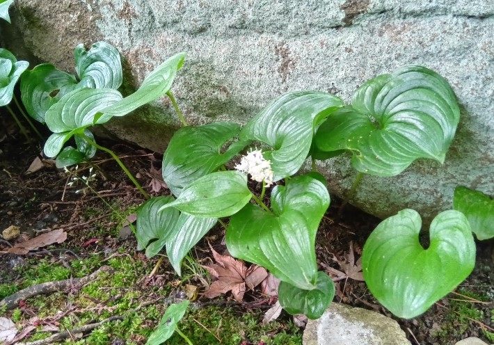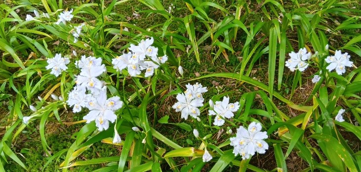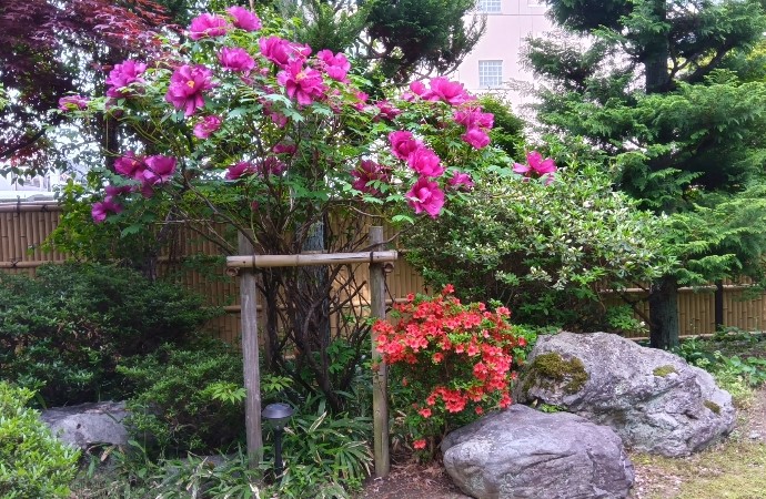 5月も半ばを過ぎ、庭園の緑も若葉から新緑に向かっています。 そんなお庭にいろどりを添えるお花をご紹介します。 まず入口の左側の牡丹とつつじが見頃です。今年の牡丹は花が多く「私を見て!」と言わんばかりに咲き誇っています。 可憐な白い花はアヤメの仲間ヒメシャガです。 鶴が舞う時の羽のような葉の舞鶴草は、玄関前の大きな水盤の足元に咲きました。