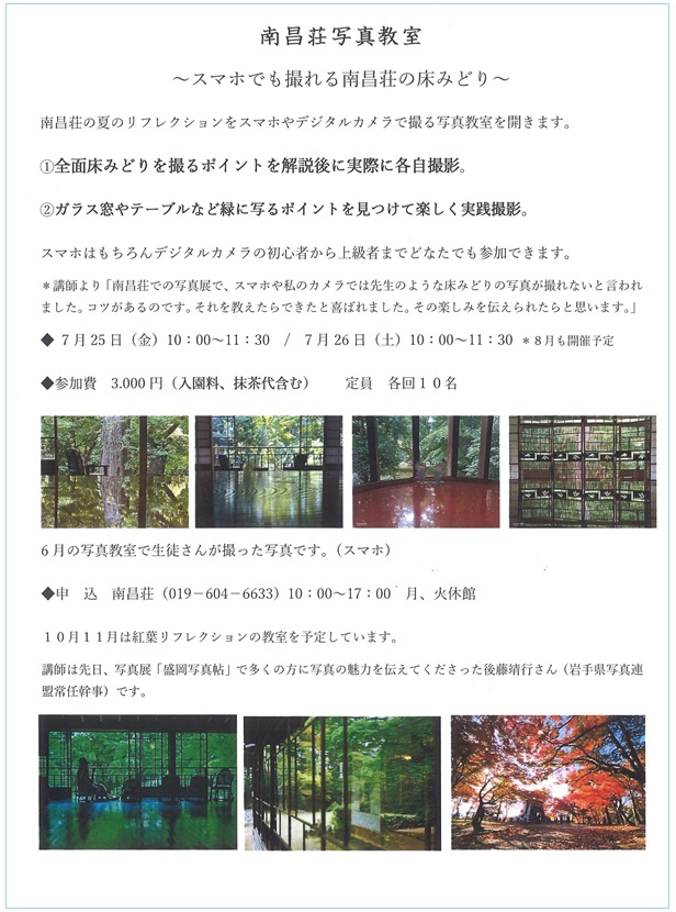 南昌荘に何度か足を運んだ方や、初めていらっしゃる方にお気に入りの南昌荘を見つけてほしい写真教室のご案内です。(先月の参加者の写真ものっています。)