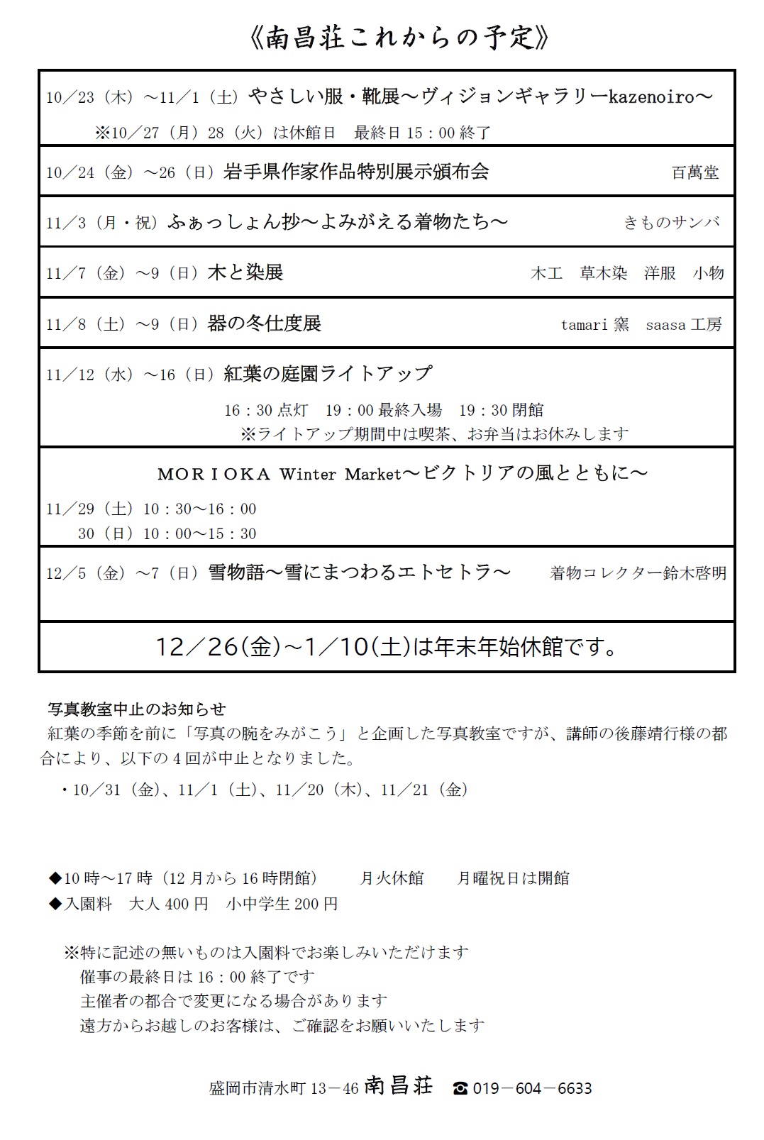 南昌荘 12月7日(日)までの催し物
