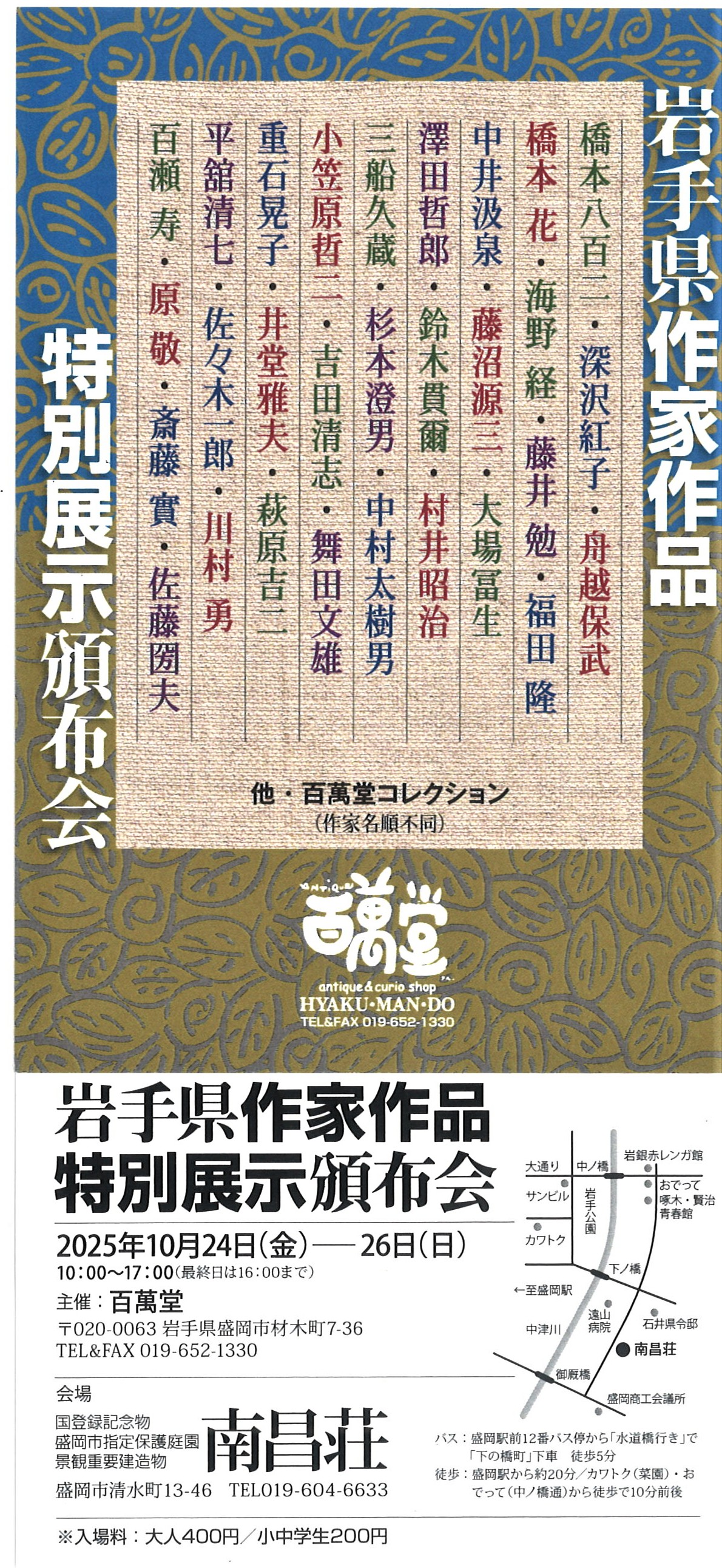 盛岡市材木町の骨董屋さん「百萬堂」の展示頒布会が開かれます。