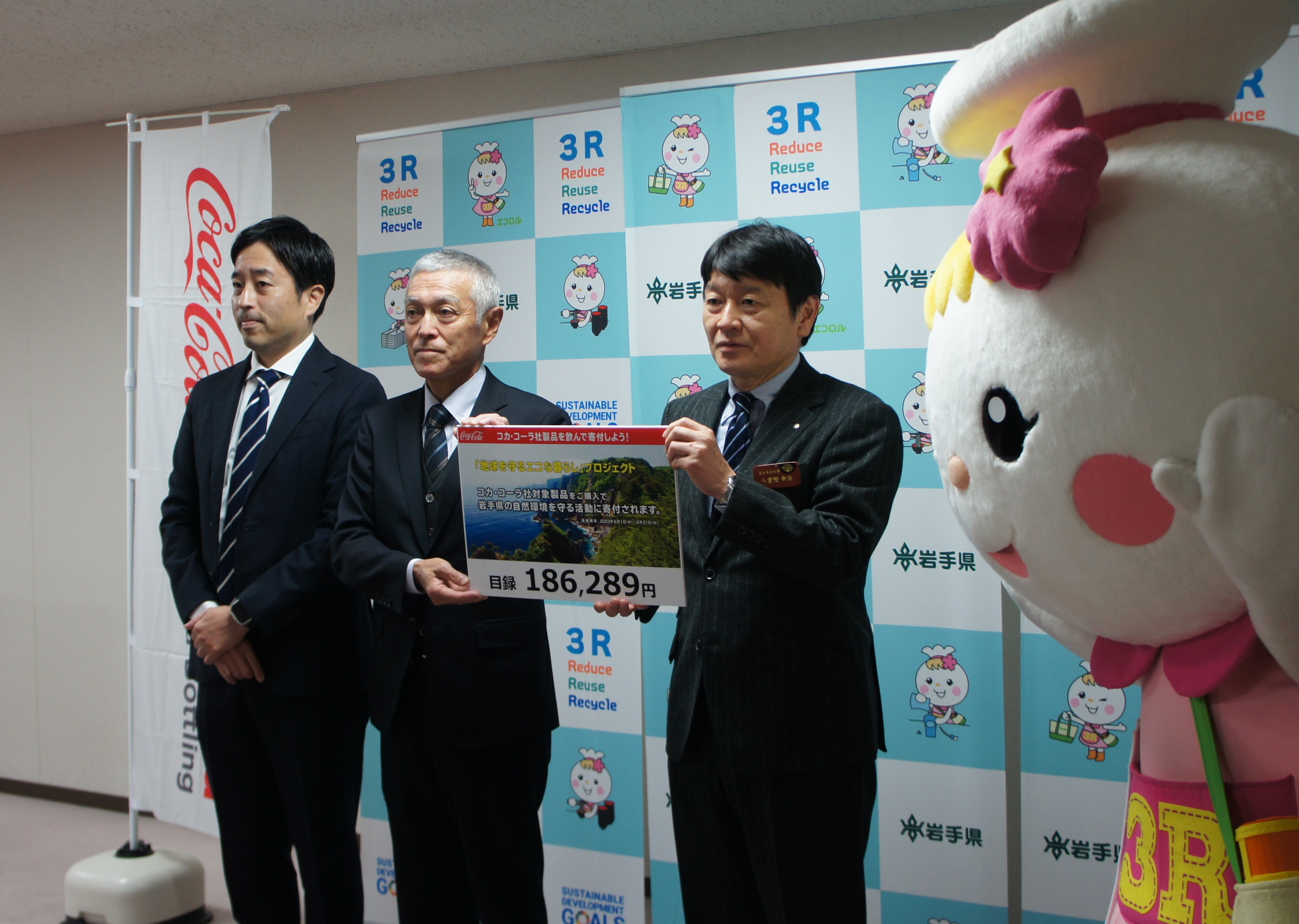 いわて生協は、みちのくコカ・コーラボトリング株式会社様との共同企画「地球を守るエコな暮らしプロジェクト」に取り組み、11⽉20⽇(月)岩手県に売り上げの一部18万6,289円を贈呈いたしました。