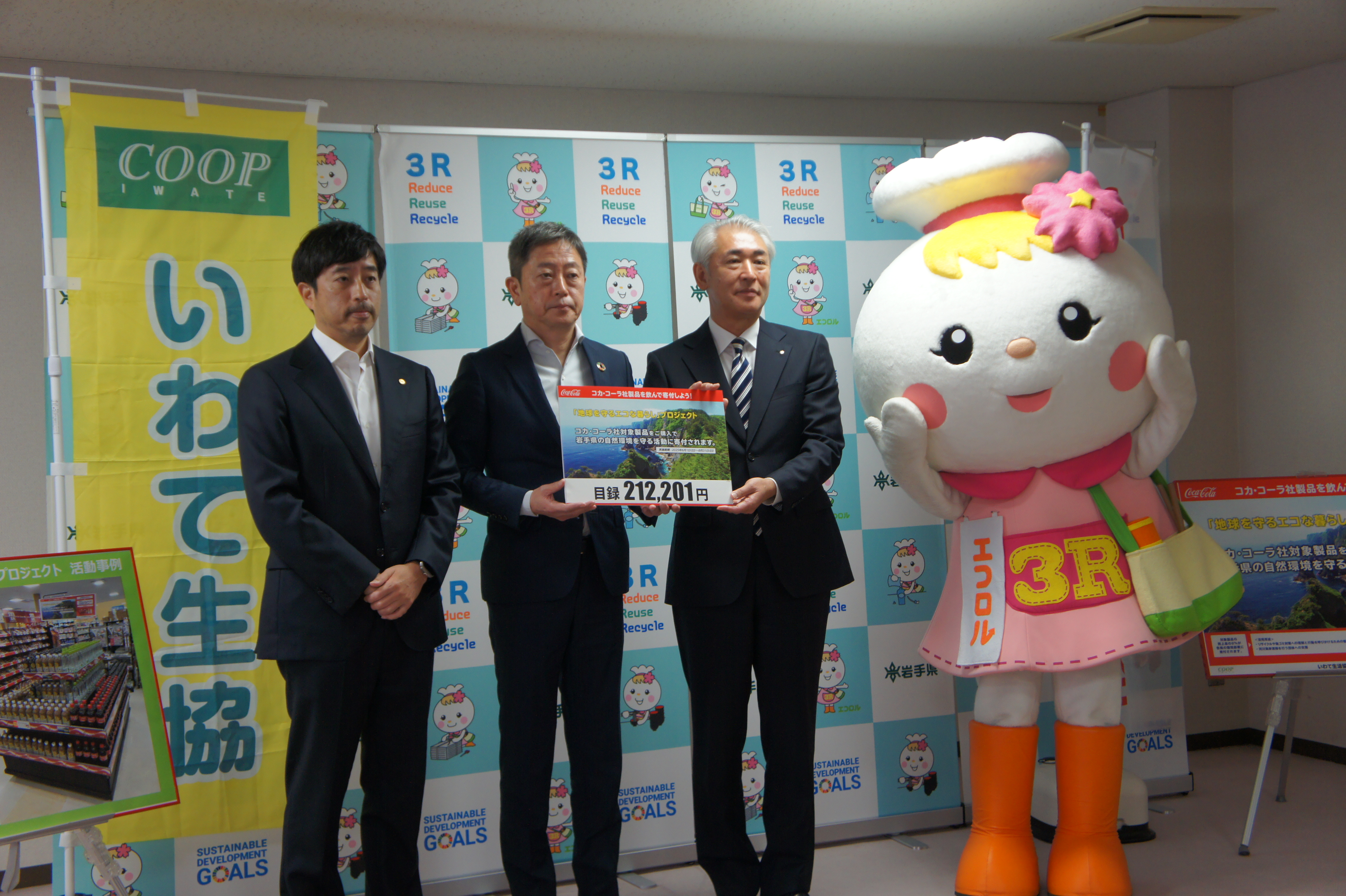 いわて生協は、みちのくコカ・コーラボトリング株式会社様との共同企画「地球を守るエコな暮らし」プロジェクトに取り組み、11月5日(水)岩手県に売り上げの一部21万2,201円を贈呈いたしました。