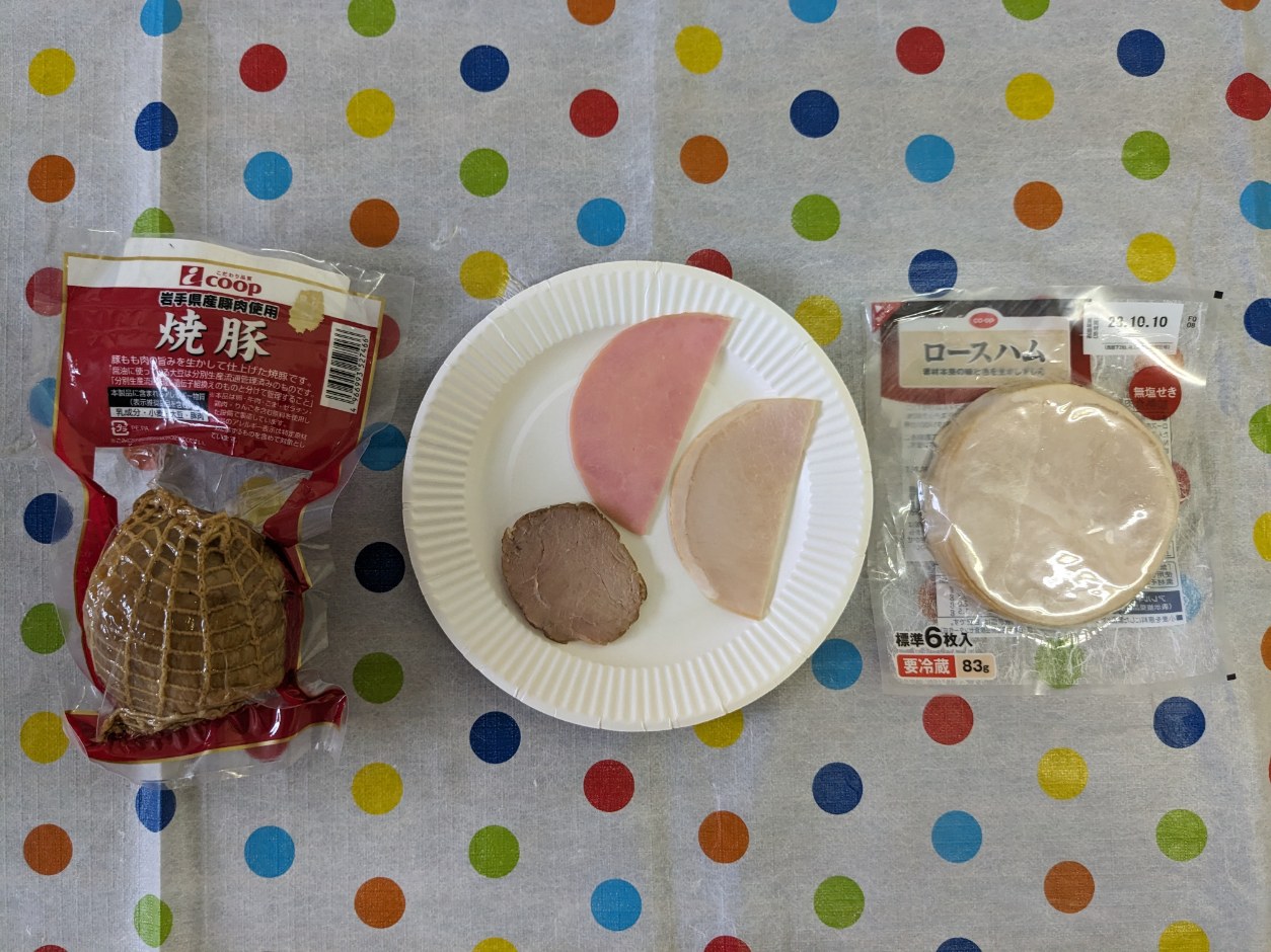 試食は産直肉を使ったアイコープ焼豚、コープロースハムで、他社