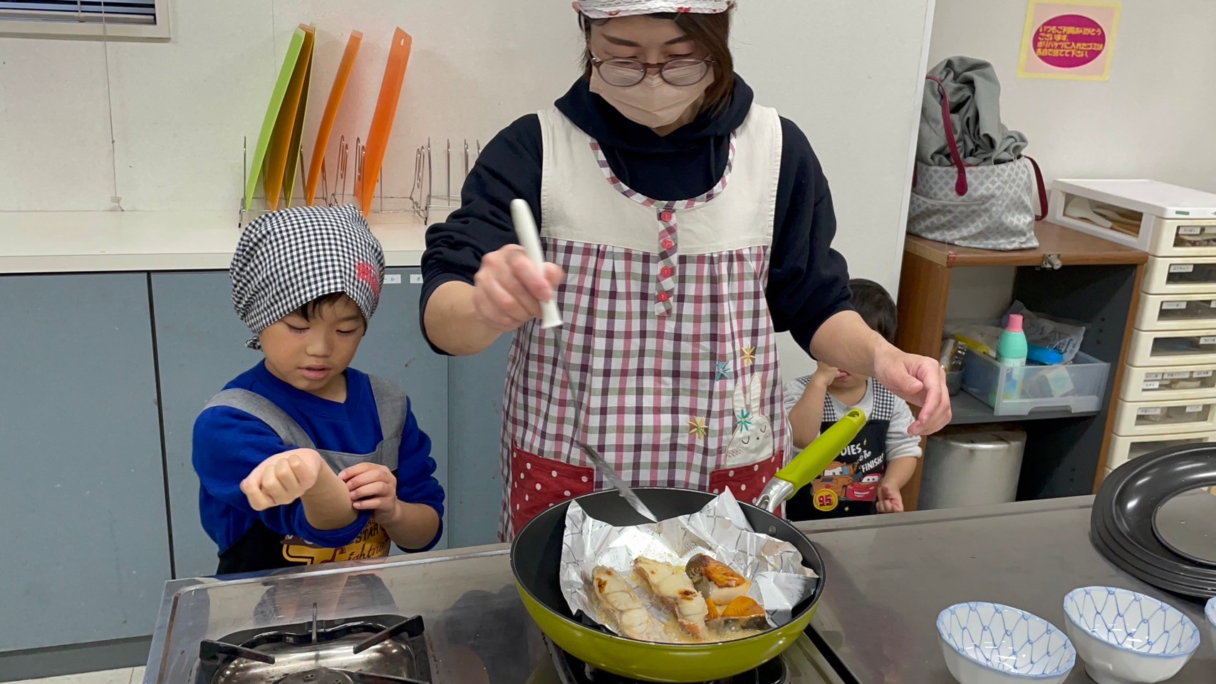 使用した漬魚は、銀たらのみりん漬けと、目抜の塩麴漬け。どちらもフライパンで焼きました。くっつかないホイルをしいて、片面が焼けたころに料理酒をふりかけました。調理は、火をつける前のフライパンに漬魚を置き(コールドスタート)、焼けたらひっくり返す、という簡単なものだったので、親子で楽しめた様子でした。