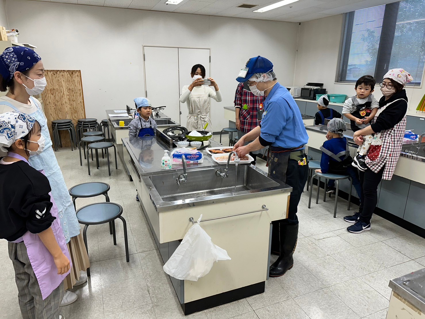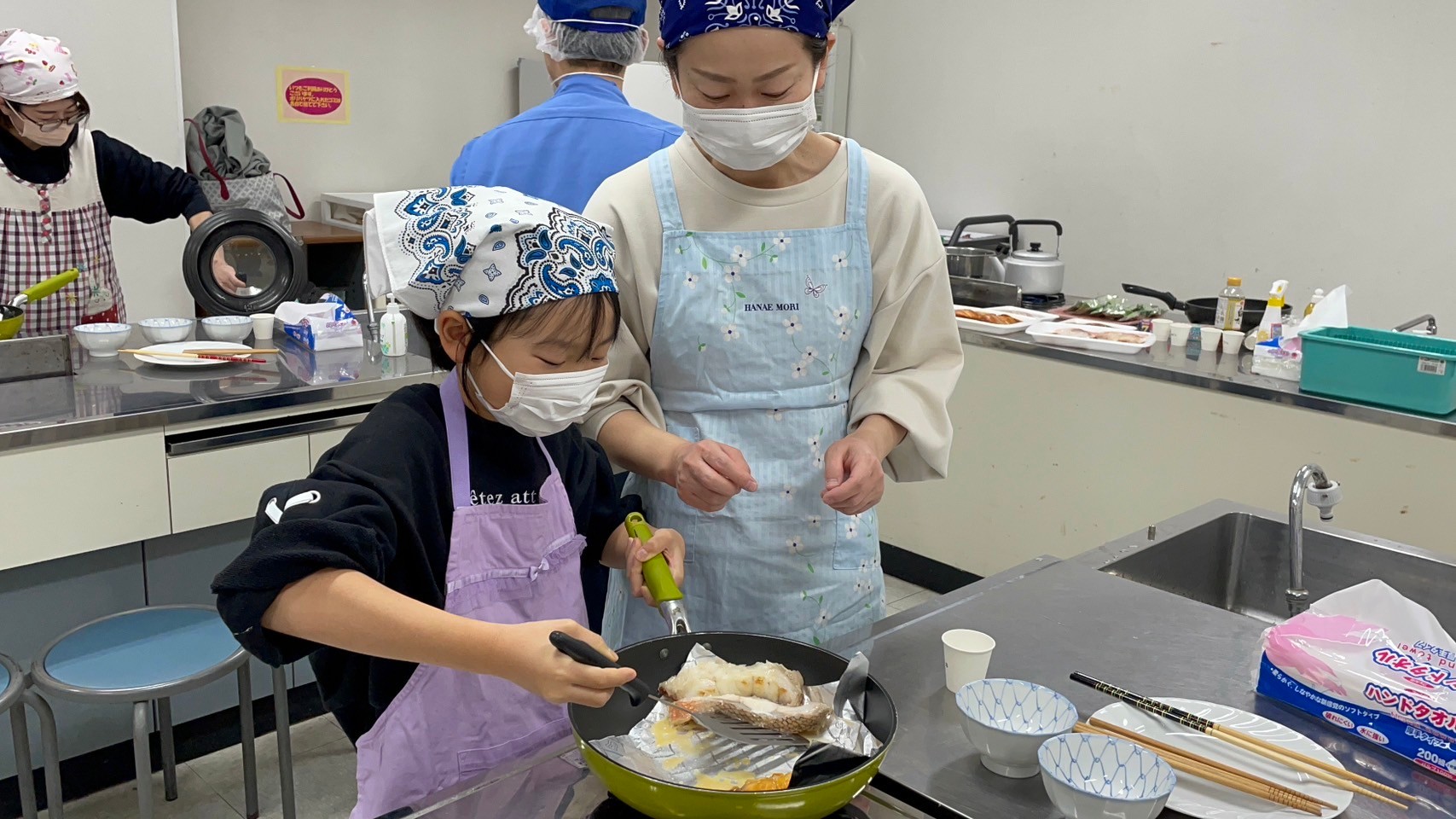 「親子で魚を調理して、ランチを作って食べよう!」と呼びかけ、12月3日、コープ一関コルザの調理室で開催、4組10人の親子が参加しました。