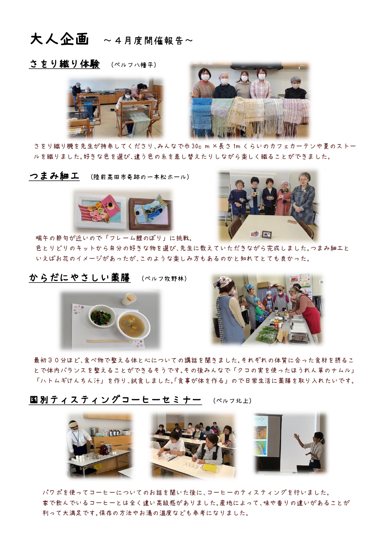 大人企画とは…シニアのいきいきとしたくらし・健康づくりのために、「大人企画」を多彩な内容で、生協の店舗や地域公民館などで開催しています。 4月は県内各地で16企画を行いました。その一部をご紹介します。