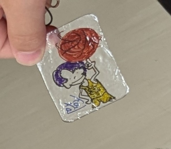 プラ板でキーホルダーづくりは、お弁当のフタを10cm幅に切り出したものに、好きなイラストや見本のイラストを油性のカラーペンで書き、オーブントースターでチン!数秒でみるみる小さくなって、薄い板が1mm位の暑さのキーホルダーになりました。