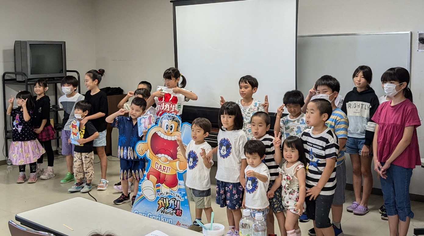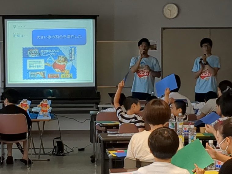 「ガリガリ君の氷の粒は、進化し続けているよ。約20年ぶりにリニューアル。どんな風にかわったかな?」など三択のクイズでは、子どもたちが元気に答えていました。