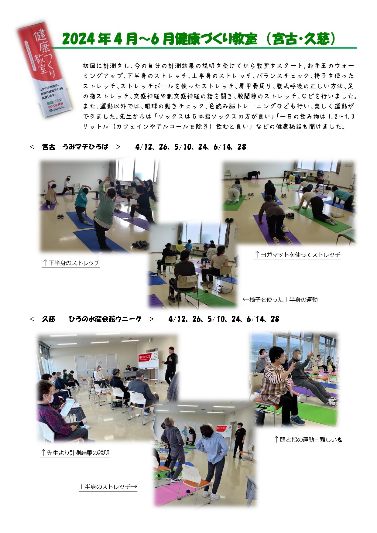 CO・OP共済連から助成を受けて始まった健康づくり教室は、全6回のコースで、3か月ごとに会場を変えて実施しています。4月~6月は、宮古・久慈地域で行いました。