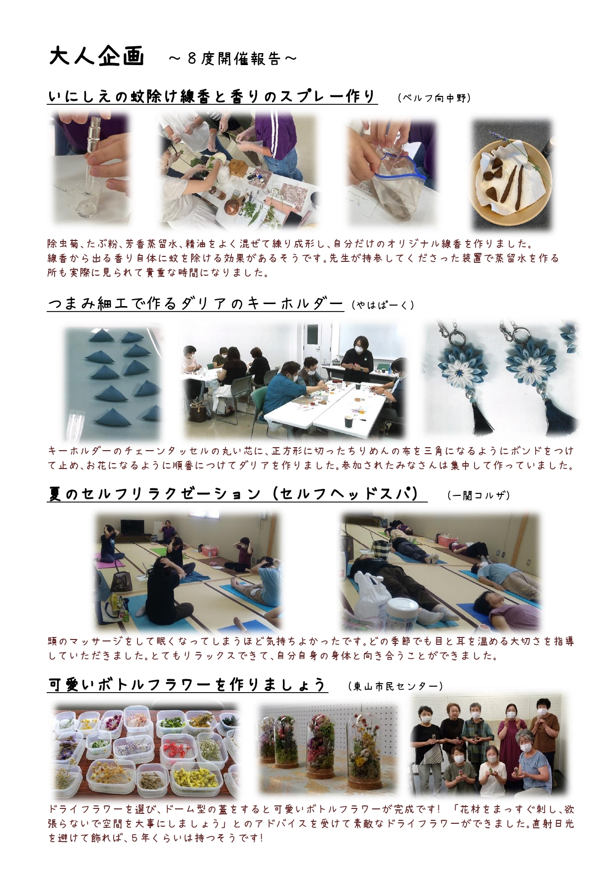 大人企画とは…シニアのいきいきとしたくらし・健康づくりのために、「大人企画」を多彩な内容で、生協の店舗や地域公民館などで開催しています。 8月は県内各地で13企画を行い、117人の参加でした。その一部をご紹介します。