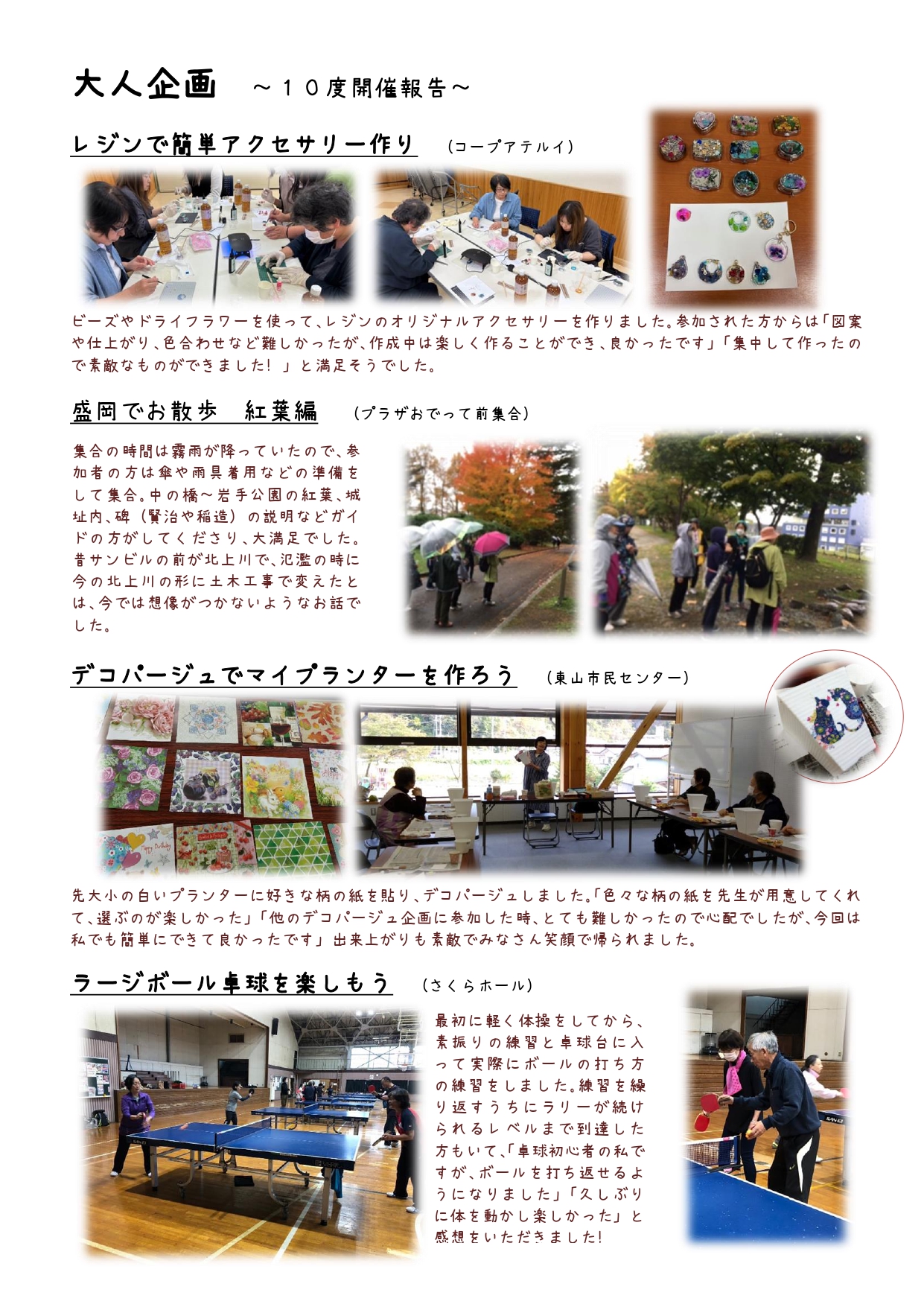大人企画とは…シニアのいきいきとしたくらし・健康づくりのために、「大人企画」を多彩な内容で、生協の店舗や地域公民館などで開催しています。 10月は県内各地で16企画を行い、131人の参加でした。その一部をご紹介します。