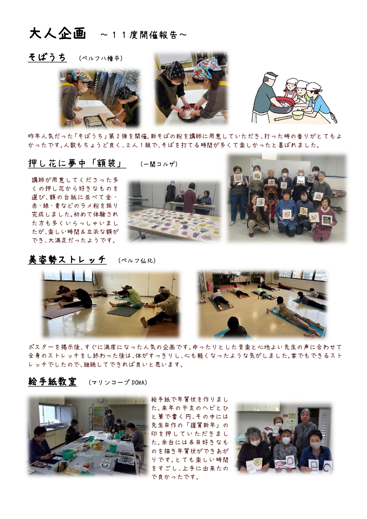 大人企画とは…シニアのいきいきとしたくらし・健康づくりのために、「大人企画」を多彩な内容で、生協の店舗や地域公民館などで開催しています。 11月は県内各地で19企画を行い、177人の参加でした。その一部をご紹介します。